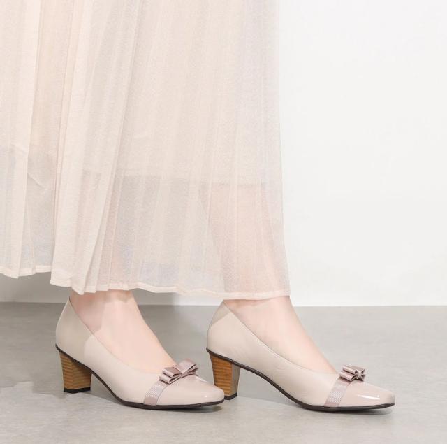 トゥ部分のリボンがお洒落さを際立てている3Eのパンプスです。