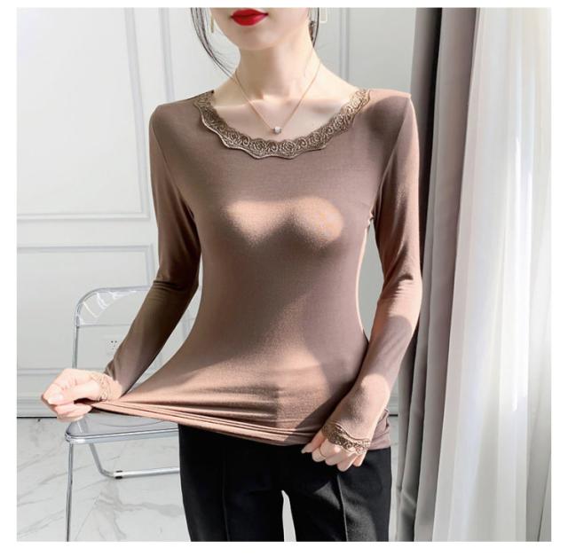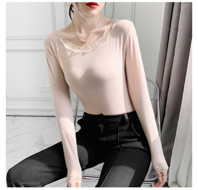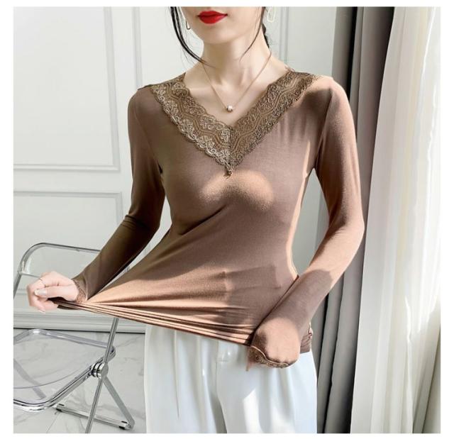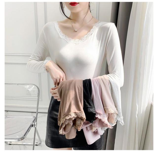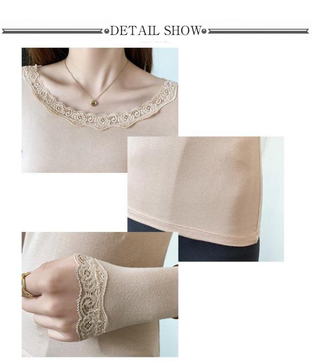 トップス Vネック 裏起毛 トップス 秋冬 長袖 レディース インナー インナー カットソー あったか 防寒インナー tシャツ Tシャツ レース あったかインナー 防寒 スリム タイト 厚手 春 ヒートウエア 無地 保温 ストレッチ素材 着痩せ