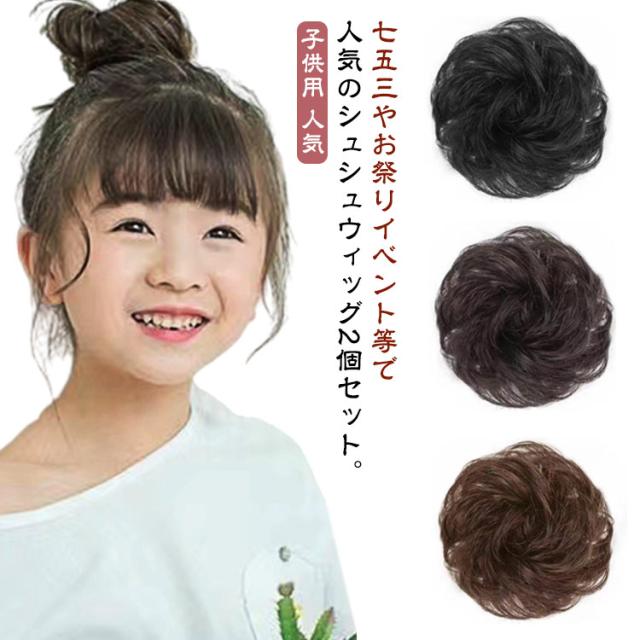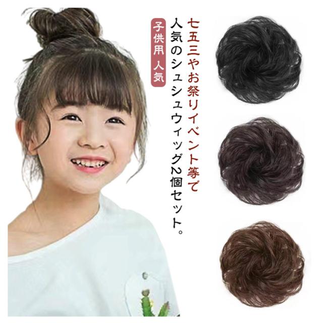 キッズ キッズ 2個セット ブラック ウィッグ イベント シュシュ 茶 子供用 着物 ポイントウィッグ 黒髪 お団子ウィッグ 部分ウィッグ つけ毛 ダンス 髪飾り浴衣 送料無料 つけ髪 韓国ウィッグ