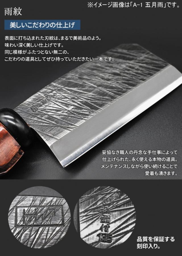 妥協なき職人の丹念な手仕事によって仕上げられた、永く使える本物の道具。 メンテナンスしながら使い続けることで愛着も湧きます。 枝を集めたり刃先を守るための突起付き。 刃研ぎが容易で耐摩耗性に優れた鋼付。 刃先が厚く丈夫な「両刃」仕様。 雨をモチーフにした波紋は無二の模様で、まるで美術品のよう。 人間工学に基づいたエルゴノミクスハンドル。 指へのフィット感を追求。耐久性に優れている堅くて粘りがある樫材を使用。 牛本革ケース付きで持ち運びも安心です。 |