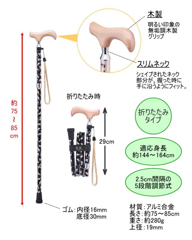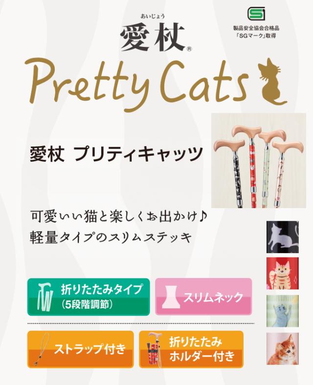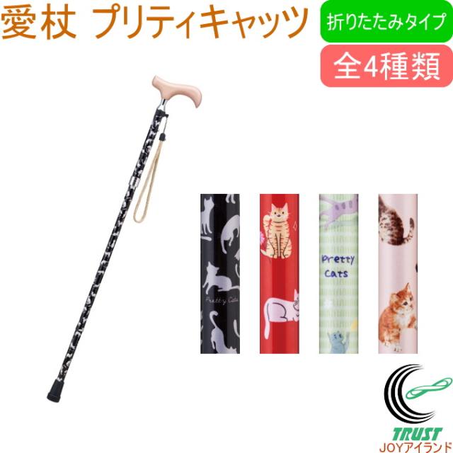 愛杖 プリティキャッツ 折りたたみタイプ 全4種類 送料無料 杖 折りたたみ 木製グリップ 介護 歩行補助 シニア 高齢者 サポート スリムネック かわいい おしゃれ オシャレ 猫 ねこ 猫柄 スマート ストラップ付 SGマーク メーカー直送 ケイホスピア