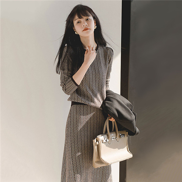 セットアップ 長袖 ニット トップス スカート レディース ラウンドネック 2点セット 上下セット ストライプ カジュアル オシャレ きれいめ 上品