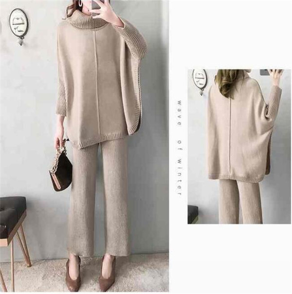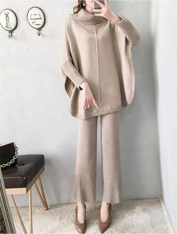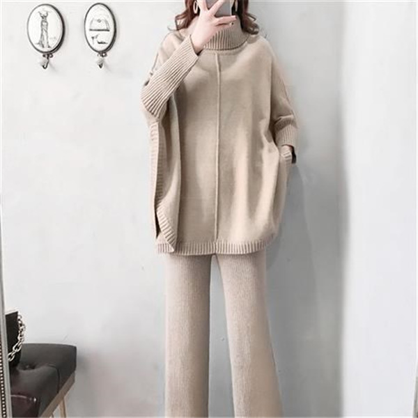 2点セット ニット トップス ワイドパンツ セットアップ レディース 長袖 着痩せ 無地 体型カバー 秋冬 韓国風 きれいめ ママ 入園式 通勤 OL