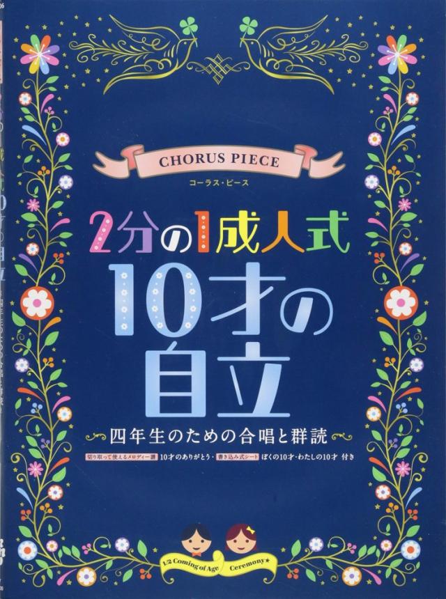 キングレコードから発売中の同タイトルのマッチング・ピース。 10才になったから気がつける、「自立」への意識。 自分を取り巻く環境(他者・社会)への客観性を意識し、自分が生きるこれからの時間について見つめてみようという「自立」をテーマにした合唱曲が多数収録されています。 感動とそして自立、1 歩前進した2分の1成人式の演出にかかせない1冊です。 【収載曲】 【合唱テーマ:感謝】10才のありがとう《二部合唱》 【合唱テーマ:故郷】ふるさと《二部合唱》 【合唱テーマ:命】いのちの歌《二部合唱》 【合唱テーマ:自立】ぼくの わたしの《二部合唱》 【合唱テーマ:思いやり】誰かのために-What can I do for someone?-《二部合唱》 【合唱テーマ:平和と歌】地球をつつむ歌声《斉唱》 【合唱テーマ:世界】世界がひとつになるまで《二部合唱》 【合唱テーマ:友だち】U&I《二部合唱》 【合唱テーマ:夢】ぼくらの夢〜夢発表〜(フルバージョン)《二部合唱》 【演出群読】10才のこころ-金子みすゞの詩とともに-《二部合唱「こだまでしょうか」入り》 【演出群読】10才の決意と感謝《二部合唱「10才のありがとう」入り》 ??特別収載?? 《切り取って使えるメロディー譜》10才のありがとう 《書き込み式シート》ぼくの10才・わたしの10才 |