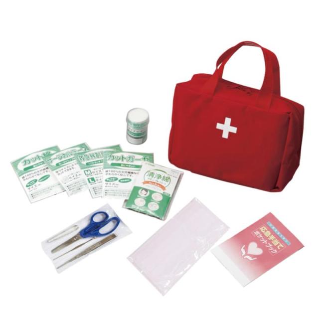 付属品:救急バッグ・ガーゼ3枚入・包帯・カット綿3枚入・救急絆創膏2サイズ×3枚・サージカルテープ・清浄綿2枚入×3包・ハサミ・ピンセット・毛抜き・耳かき・マスク・応急手当てポケットブック(日本)