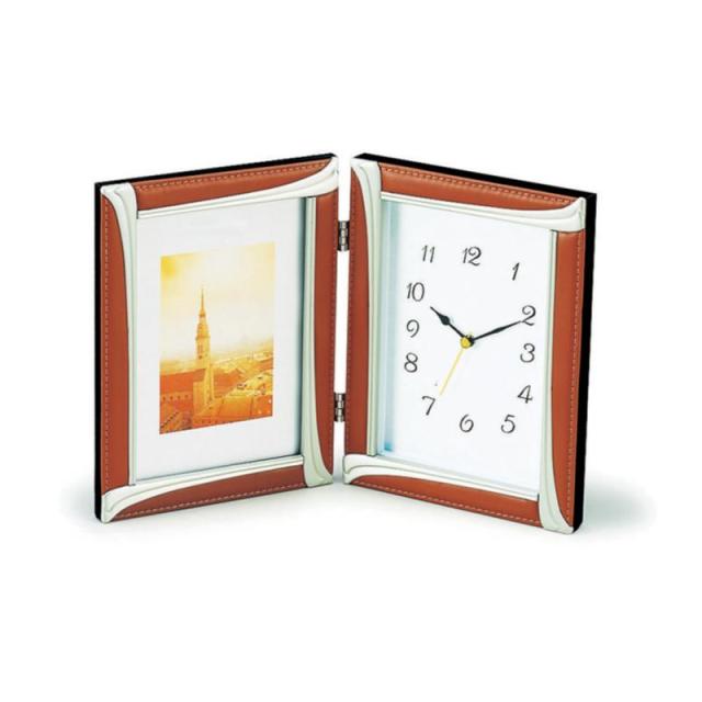 現品サイズ:アルミ材のシルバーと本革のブラウンのコンビがおしゃれなフォトフレーム&クォーツ時計です。時と共に思い出を飾る一品です。
