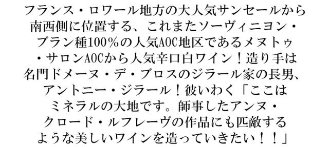 フランス・ロワール地方の大人気サンセールから南西側に位置する、これまたソーヴィニヨン・ブラン種100%の人気AOC地区であるメヌトゥ・サロンAOCから人気辛口白ワイン!造り手は名門ドメーヌ・デ・ブロスのジラール家の長男、アントニー・ジラール!彼いわく「ここはミネラルの大地です。師事したアンヌ・クロード・ルフレーヴの作品にも匹敵するような美しいワインを造っていきたい!!」
