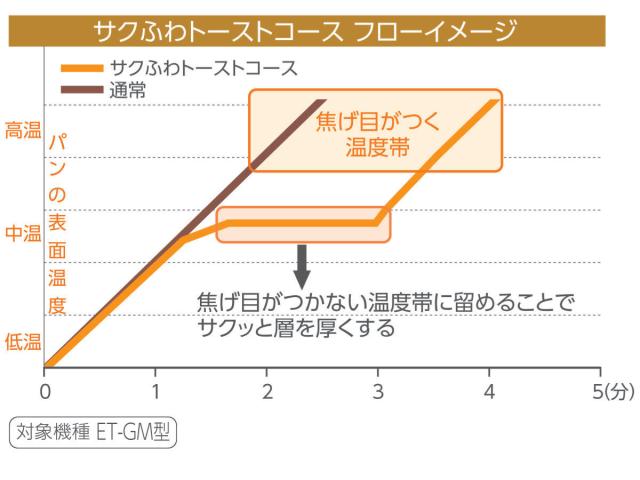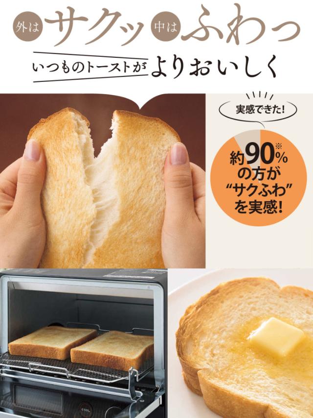 焦げ目のつかない温度帯にとどめることで、パン中央の水分をトーストの中にしっかりと閉じ込め、その後は高温で急速で焼き上げることで、通常より多くのサクッと層を生成します。