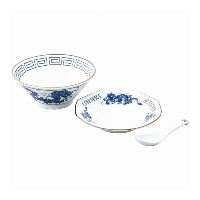 現品サイズ・内容:直径19.5cm高さ8cm容量約1050mlラーメン丼1客・直径19cm高さ3.5cmチャーハン皿1枚・全長16cmレンゲスプーン1本・磁器・[日本製]