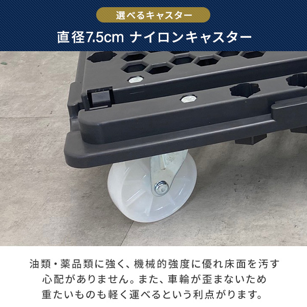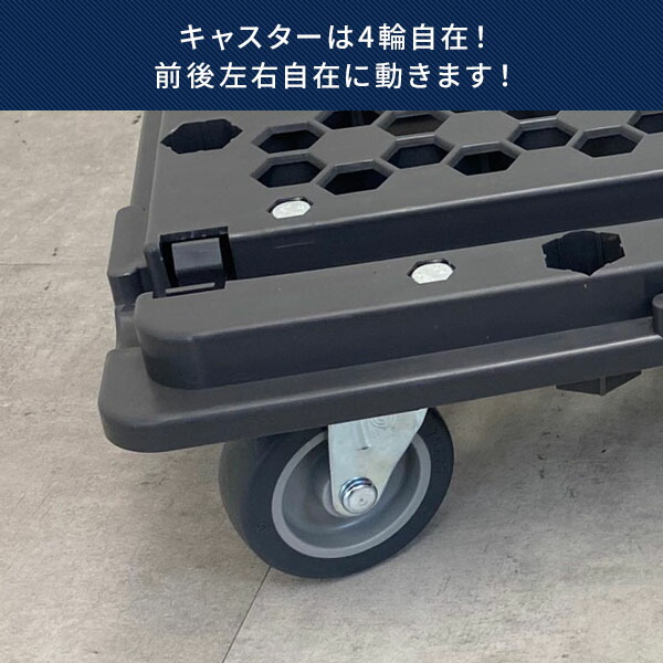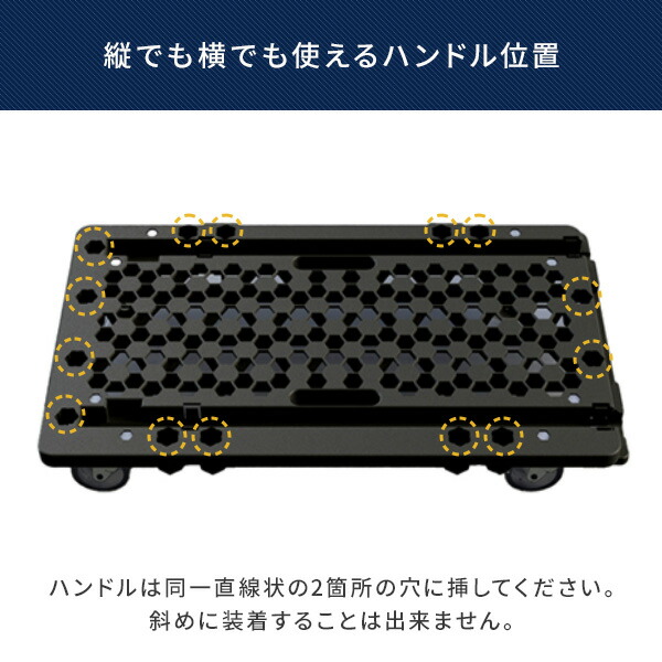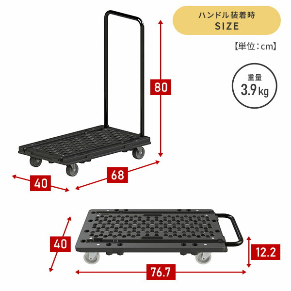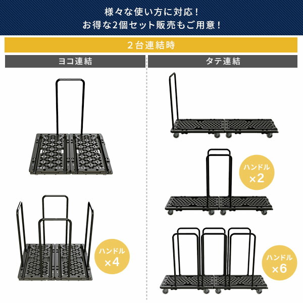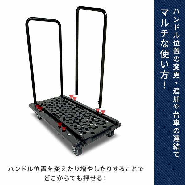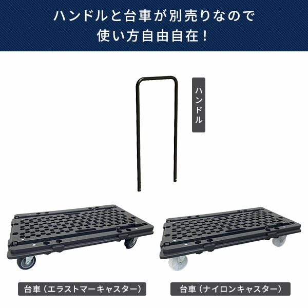 | 商品説明 | ●こちらは専用ハンドルのページになります ●専用台車NTC-N75GY/NTC-E75GYに付けることで、ハンドル台車として使用可能 ●最大荷重:200kg、ハンドル使用時150kgまで ●キャスター:直径7.5cm 自在4個 ●縦横連結可能(平台車としては推奨9台(3×3)まで) ●ハンドルの位置や数を自由に変更可能 ●ハンドルの位置を変えて、どこからでも押せます。 ●荷物の大きさに合わせて自由自在に連結可能 ●ねじれに強いリブ構造 ●ハンドルを外した状態でスタッキング可能(9台まで) ●全キャスター、360度自在に回転するので運搬しやすい ●長尺物の運搬にも最適 |