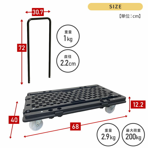 | 本体サイズ | 幅30.7×奥行2.2×高さ72cm 重量1kg 別売り平台車+ハンドル:幅40×奥行68×高さ80cm 重量3.9kg (収納時)幅40×奥行76.7×高さ12.2cm |