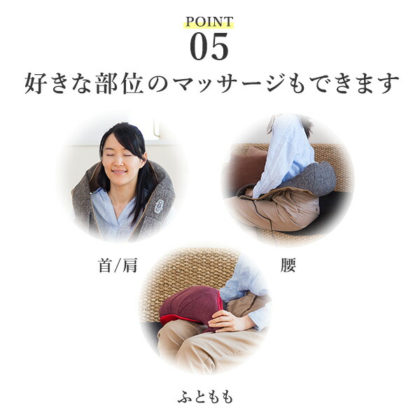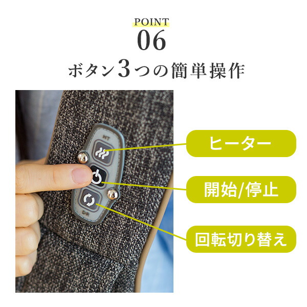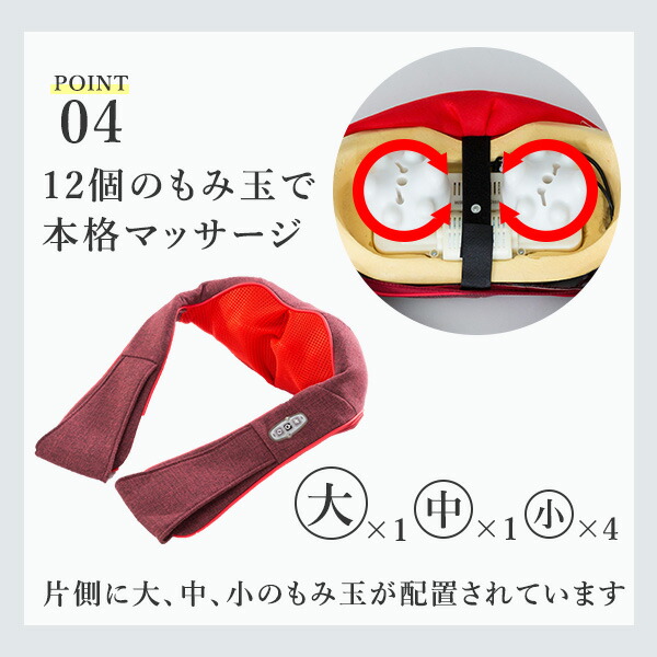 | 商品説明 | ●医療機器認証番号:230AABZX00011000 ●電気定格:AC100V 50-60Hz ●本体定格電圧:DC12V ●消費電力:17W ●オートタイマー:約20分 ●モミ回転数:約30回/分 ●電源コード長さ:約1.8m ●肩こり、腰痛、手軽に体をケアしたい方におすすめ ●体にフィットする流線形デザイン ●大・中・小の突起付きモミ玉が回転することで、首肩にフィットしてコリにアプローチ ●手動で入/切が可能なヒーター搭載 ●正転と逆転を繰り返す自動コース、手動で回転切り替えを行うことも可能 ●部位:首/肩/ふともも |
