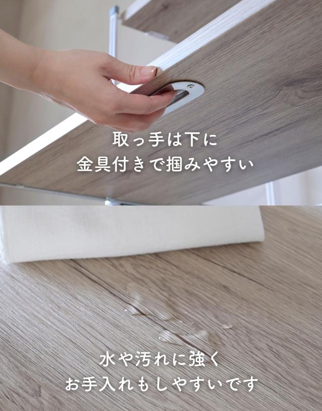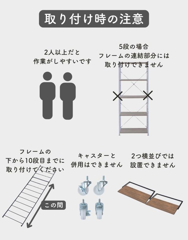| 材質 | フレーム: スチール(粉体塗装) 棚板: 合成樹脂化粧繊維板(塩化ビニル樹脂) |