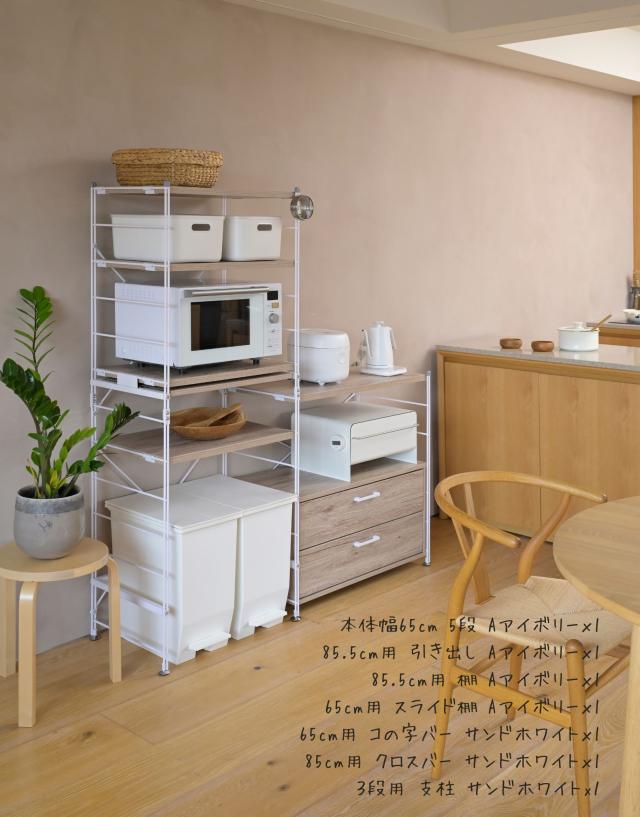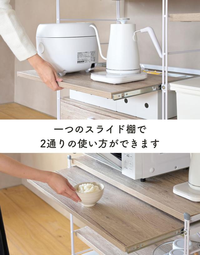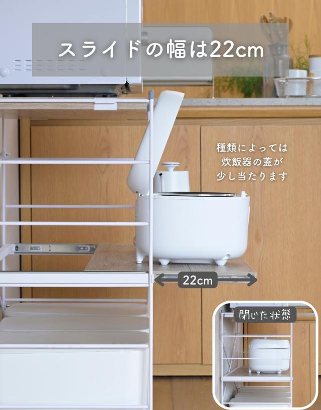 | 商品説明 | ●※本ページはオプションパーツ販売ページです。本体は別売りです。 【取り付け時の注意事項】 ※棚板の下でトレーとして使う場合は、2人以上ですと設置しやすいです。 ※本体フレームの桟、下から10段目までの間に取り付けてください。 ※5段で使う場合、フレームの連結部分には取り付けできません。 ※キャスターと併用はできません。 ※連結時、コの字バーと並列はできません。 ●ウッドシェルフに後付けできる専用スライド棚 ●本体幅65cm用 ●レール式でスムーズな開閉 ●棚板の下に付けるとちょい置きできるトレーに ●木の質感があってお手入れもかんたん ●キッチン家電も省ペースで収納 ●内寸 幅: 56、奥行き: 33.5cm ●スライド幅: 22cm ●耐荷重: 14kg ※ラック本体の全体耐荷重は商品サイズにより異なるため、ラック本体よりご確認お願いします。 |