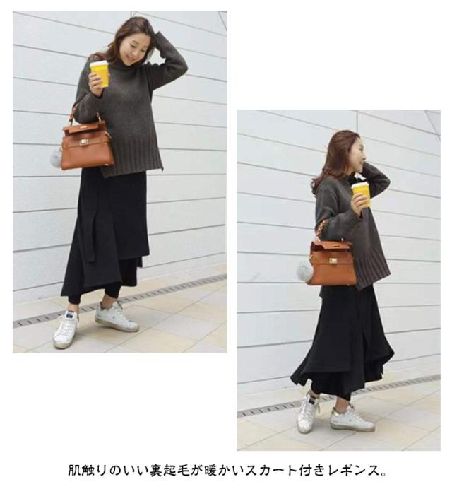 | 裏起毛あり/無し!スカート付きレギンス 肌触りのいい裏起毛が暖かいスカート付きレギンス。 女性らしさを感じる膝下の丈で、着回しにも優れております。 ストレッチが効いているので締め付け感も少なく、体型をカバーしながら スカートスタイルをお楽しみいただけます。 嬉しい裏起毛&薄手の2タイプがあって、 シンプルなブラックとグレーはデイリー使いやすいです。 | |