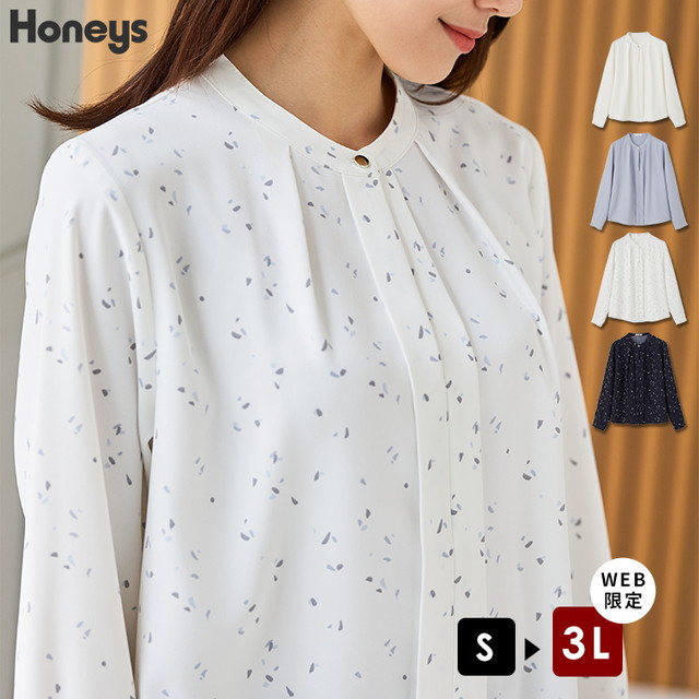 トップス ブラウス 長袖 大きいサイズ オフィス きれいめ バンドカラー 無地 幾何柄 再生ポリエステル レディース Honeys ハニーズ バンドカラーブラウス
