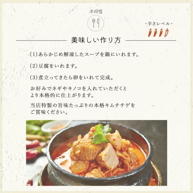 あとはパックを解凍後お豆腐を加えてお鍋で温めるだけで本場のキムチチゲがお楽しみ頂けます。
