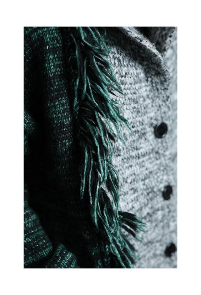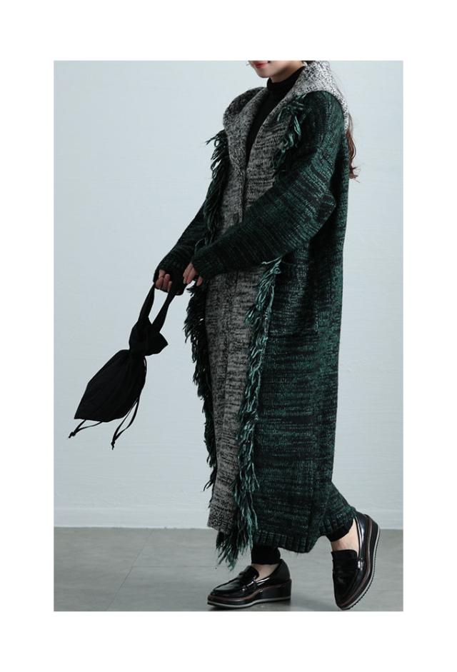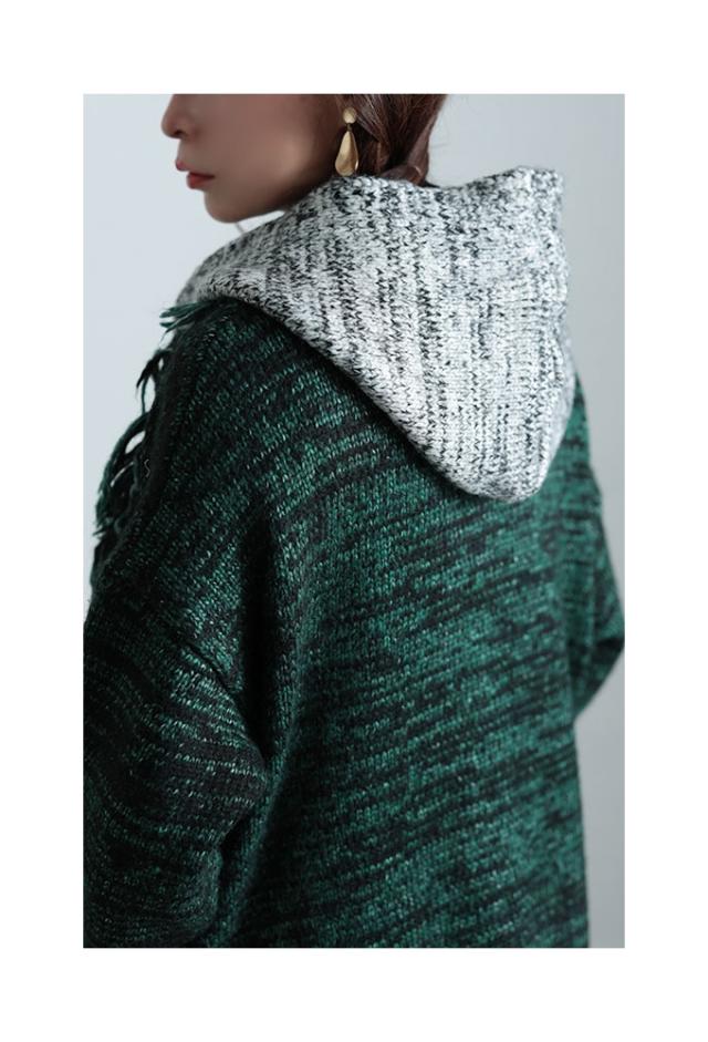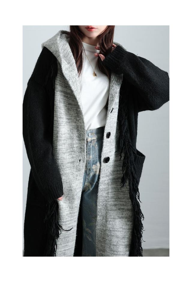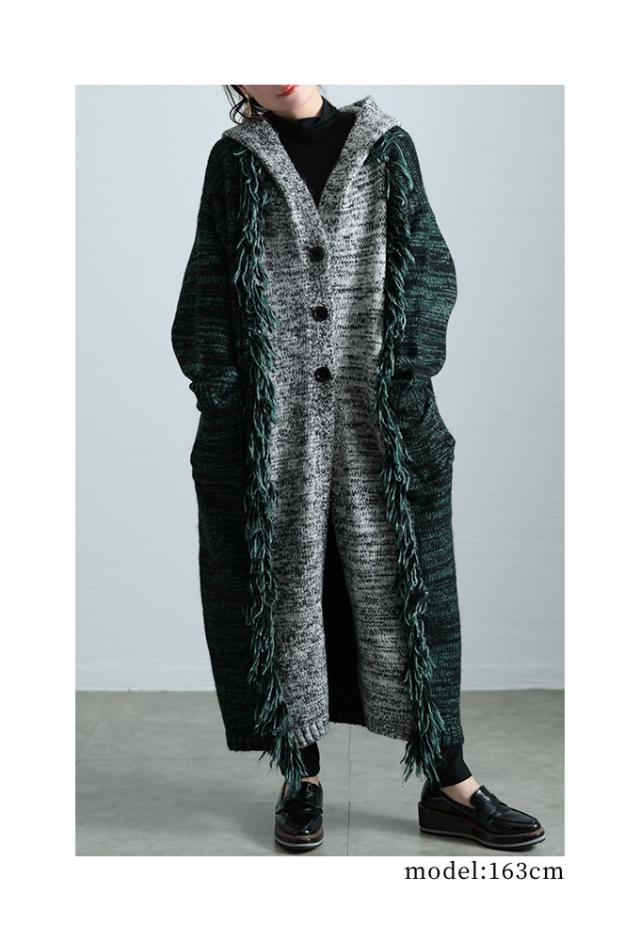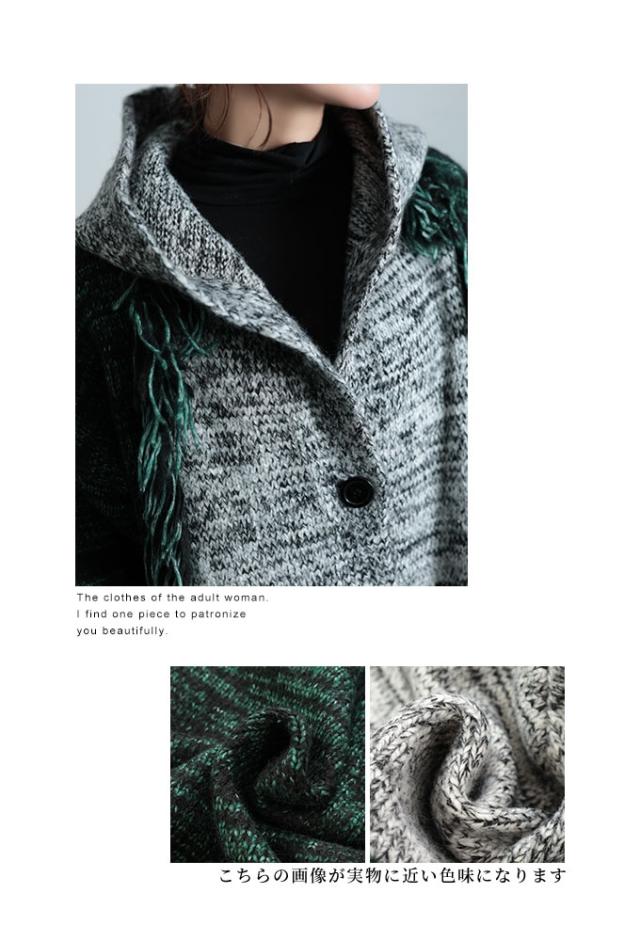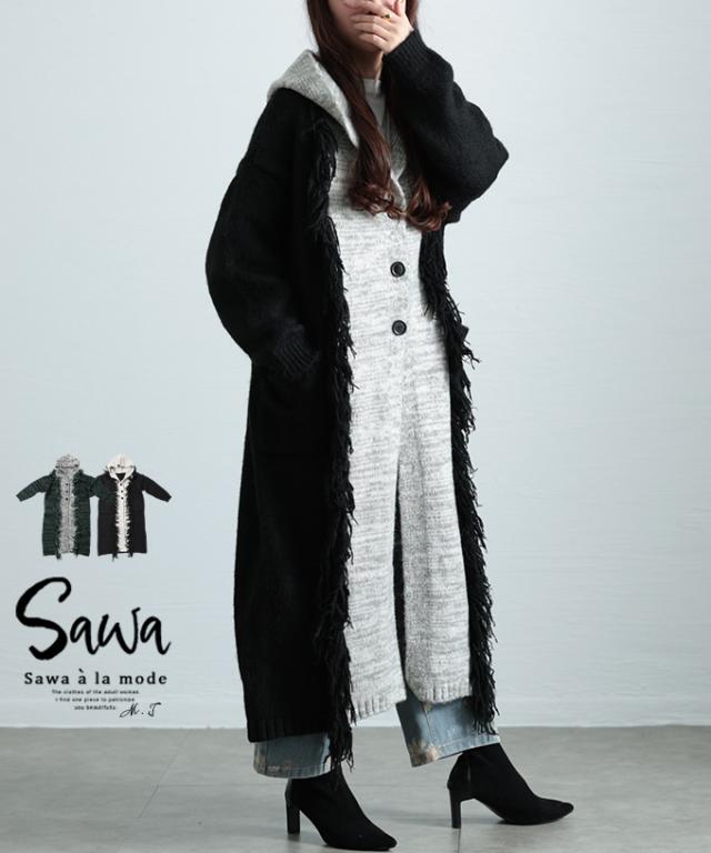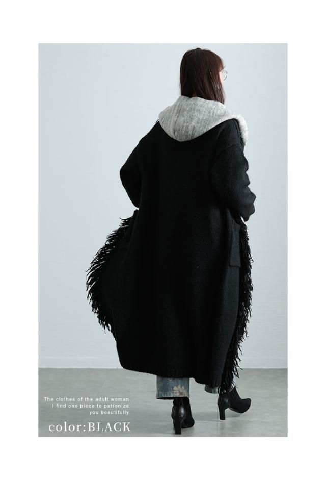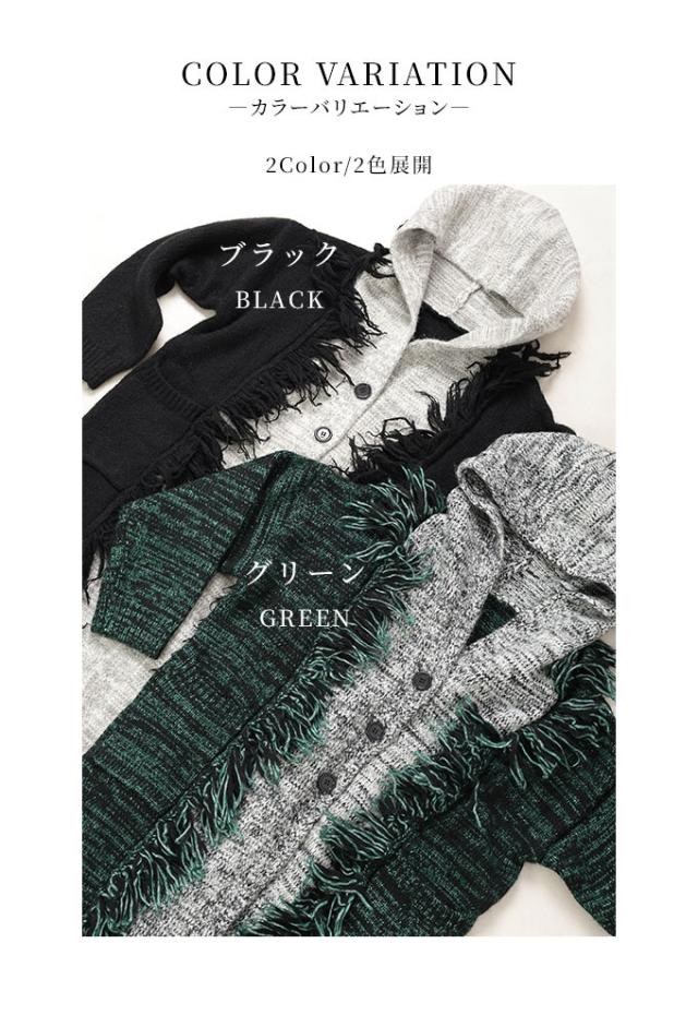 春新作 大人映えする配色フーディーニットコート レディース ファッション アウター ニット パーカー ロング 長袖 配色 羽織り フリンジ ボタン 黒 緑 30代 40代 50代 60代 サワアラモード sawaalamode otona 大人 cawaii 可愛い 洋服 かわいい服 sawa-9812