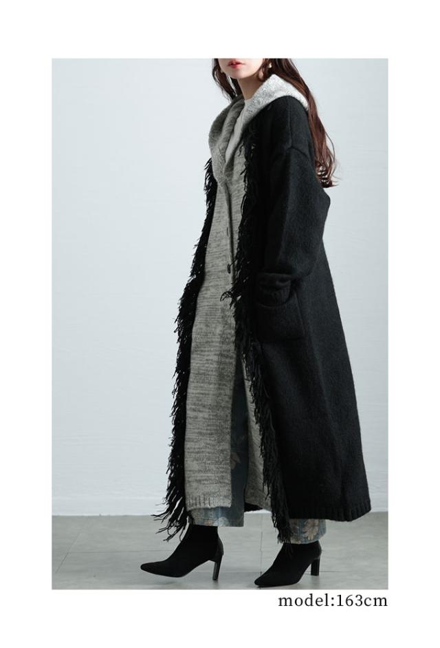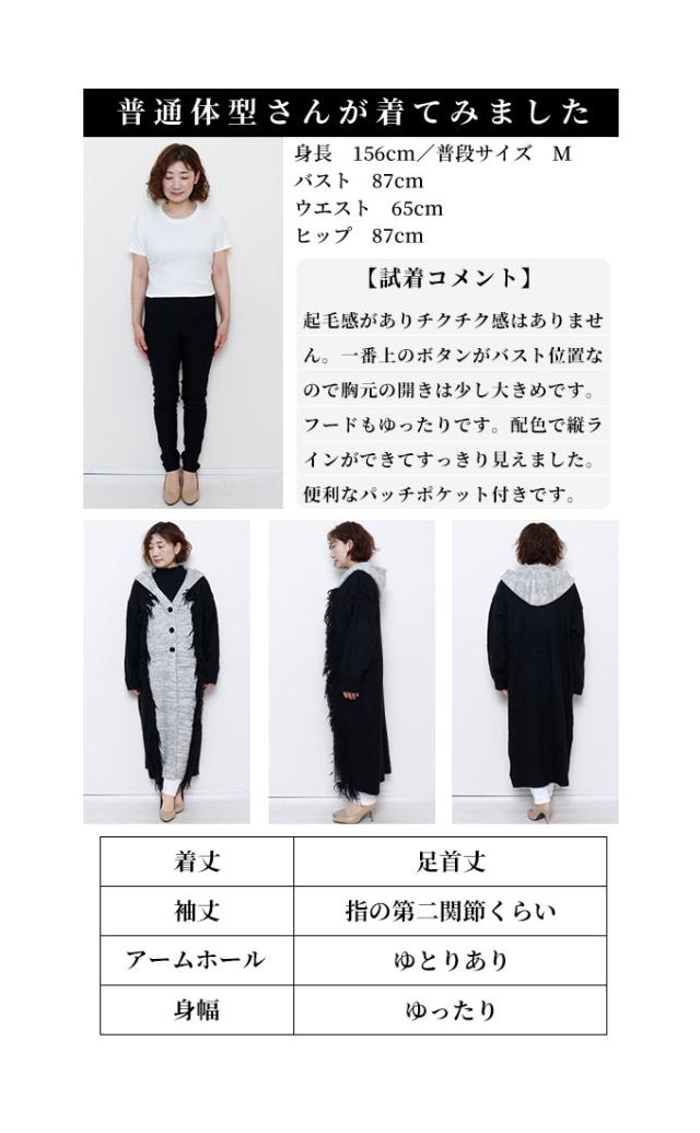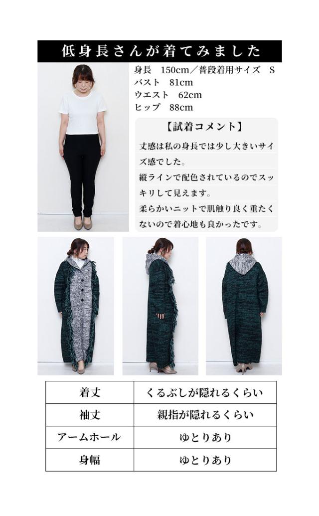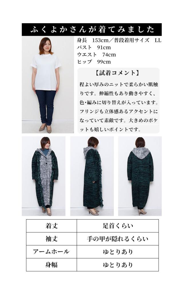 着丈は足首丈、袖丈は指の第二関節くらいでした。起毛感があり、温かみのあるニットコートです。チクチク感はありません。3つ並んだ一番上のボタンがバスト位置辺りなので、胸元の開きは少し大きめです。身頃はゆったり、フードはゆったり被れる大きさでした。配色切り替えで縦ラインができてすっきり見えました。長めのフリンジもアクセントになってステキです。便利なパッチポケット付きです。