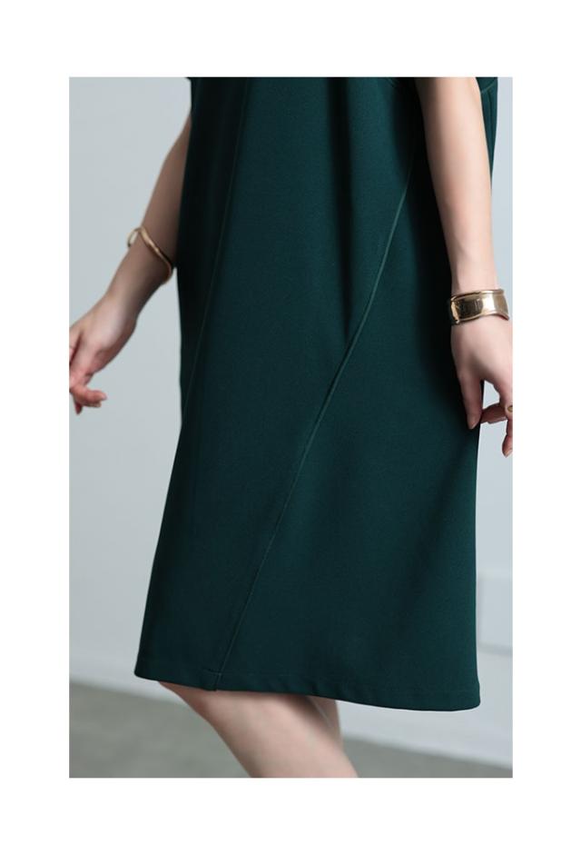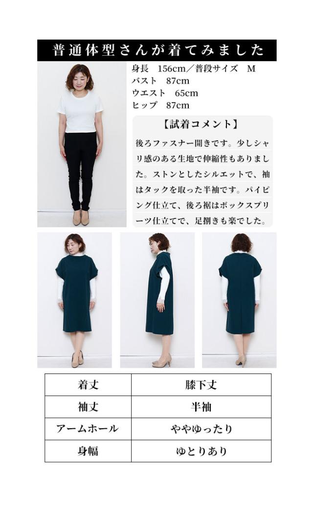 着丈は膝下丈、後ろファスナー開きです。少しシャリ感のある生地で、伸縮性もありました。ストンとしたボックスシルエットで、袖はタックを取った半袖で脇ぐりはやや広めでした。首元・肩口・サイドから裾にかかてパイピング仕立て、後ろ裾はボックスプリーツ仕立てで、足捌きも楽でした。