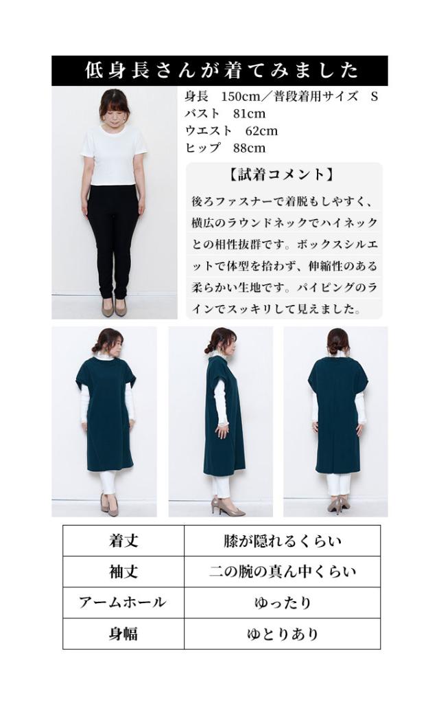 着丈は膝がすっぽり隠れるくらいです。後ろファスナーで着脱もしやすく、首元は横広のラウンドネックでハイネックとの相性も抜群です。袖は二の腕真ん中くらいです。脇グリは広く楽に着用出来ました。ボックスシルエットで体型を拾わず楽に着用出来ました。伸縮性のある柔らかい生地で肌触りも良かったです。パイピングのラインでスッキリして見えました。