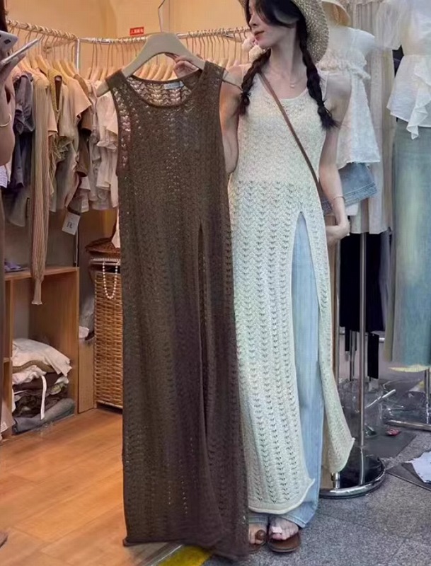 【シアーニット☆ノースリーブ ジレ ワンピ】ロングニット ワンピ ノースリーブ ジレ シアーニット サマーニット ロングワンピ ワンピース レース編み 透かし編み 春 夏 ロング丈 レイヤード シンプル トップス 送料無料