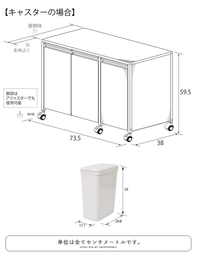 | [本体] (キャスター使用時)幅73.5×奥行38×高さ59.5cm (アジャスター使用時)幅72.5×奥行35.5×高さ55cm [ゴミ箱] 幅15×奥行27×高さ36cm(1個) |