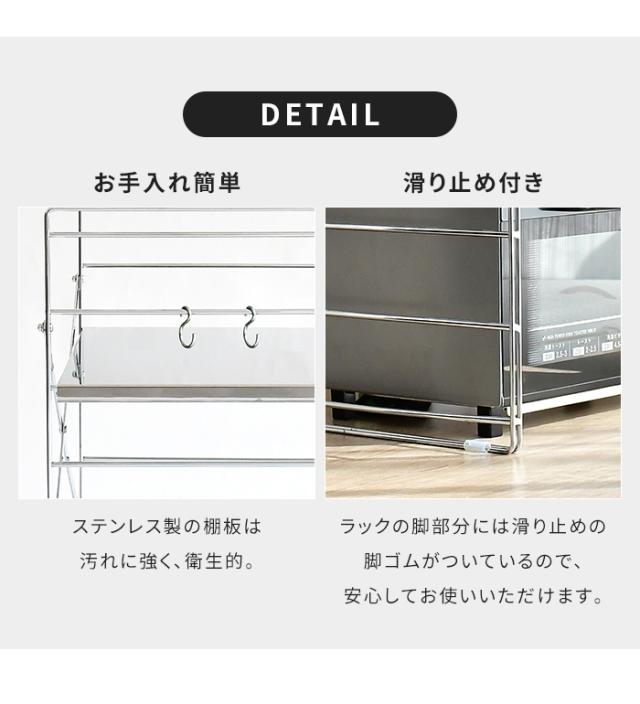 | トースター周りの空間を有効活用!キッチンの利便性を高めるスタイリッシュなラック。 棚板は耐久性に優れたステンレス製で、清潔感あふれるデザインが特徴。 棚の高さは4段階に調整可能で、トースターだけでなく電子レンジ、炊飯器などのキッチン家電を効率的に配置できます。 キチン周りのアイテムを吊り下げて収納できるS字フック付き。 安心の日本製ラック。 |