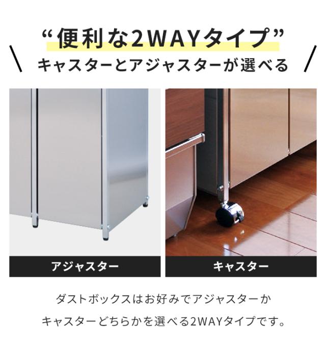 | 一見してダストボックスには見えない、清潔感溢れる洗練された外観。 表面に細かなヘアライン処理を施し、手垢などが目立ちにくく、また分別もできて機能的。 キャスターとアジャスターが選べる2way。 |