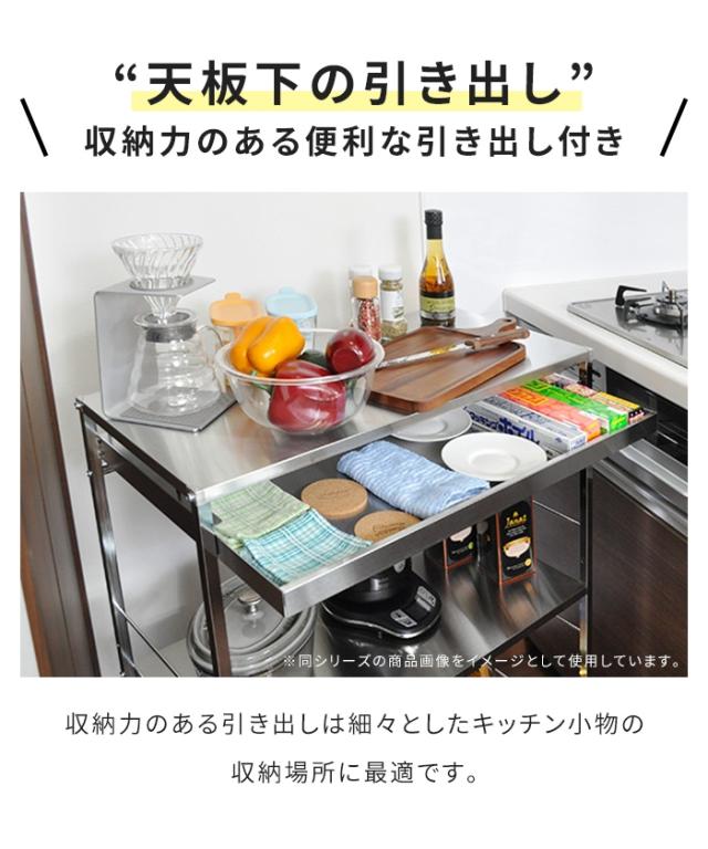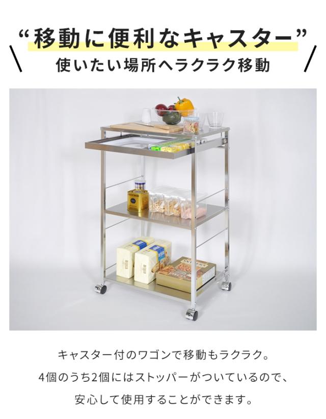 | ・ステンレス製キッチンワゴン ・キャスター付きで移動がスムーズ ・ステンレス素材でお手入れ簡単 ・小物収納に便利な引出付き ・中棚は収納物に合わせて高さ調整可能 ・四隅は保護キャップ付き |