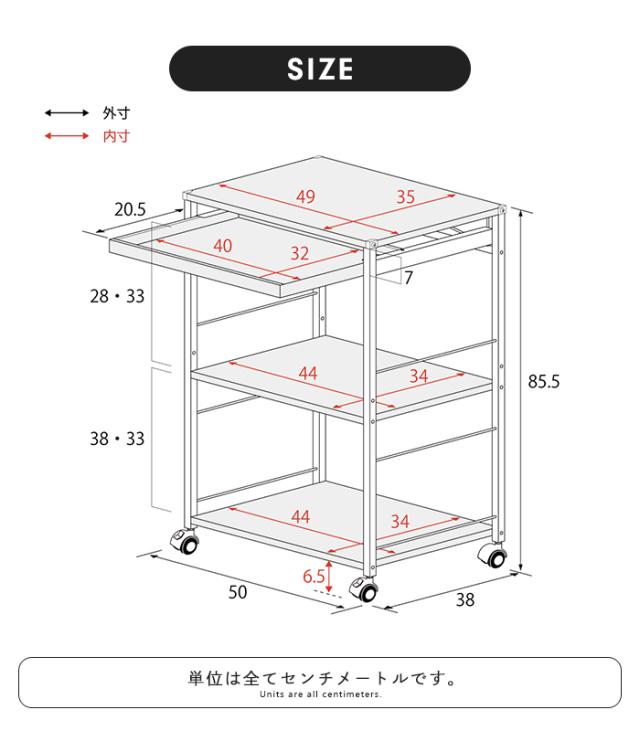 | [本体]幅50×奥行38×高さ85.5cm [天板]幅49×奥行35cm [中棚・下棚]幅44×奥行34cm |
