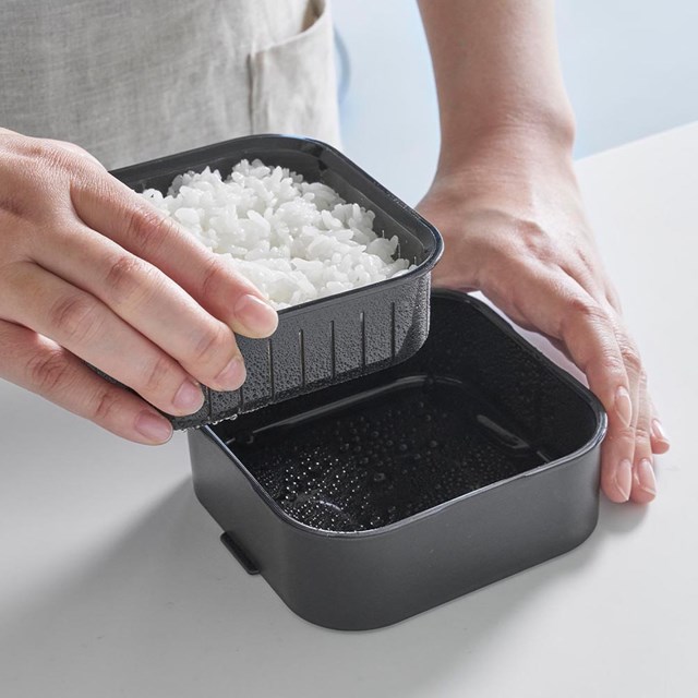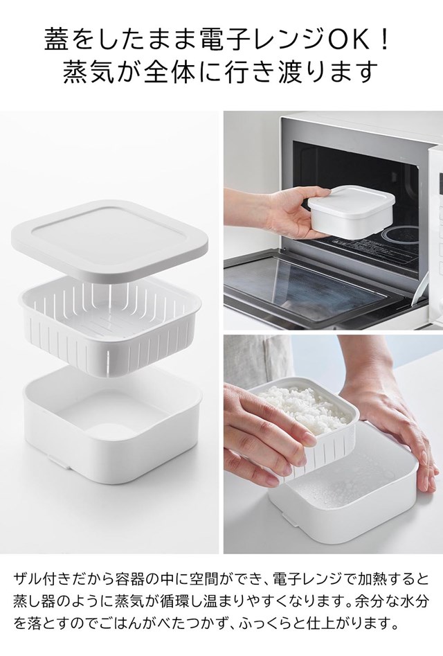 ザル付きなので、蒸し器のように蒸気が全体に行き渡り、温まりやすく一膳分(150g)の冷凍ごはんがふっくらと炊き立てのように仕上がる容器です。 |