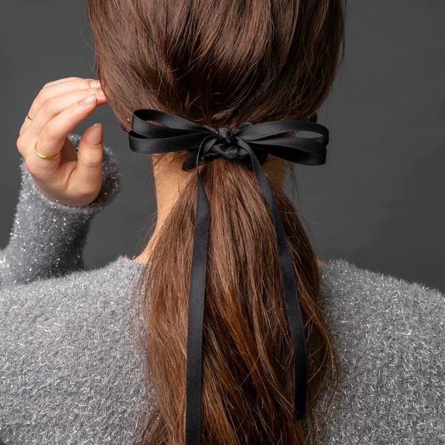 透け感のあるシュシュとロングリボンを組み合わせたヘアアクセサリー。軽やかに揺れる細めリボンで目を惹く後ろ姿にクラスアップ◎シックな大人色でコーデに取り入れやすいアイテムです。