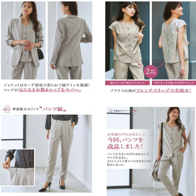 - ジャケットはガバガバ ブラウスはボタン付けがガタガタ パンツは短い。 素材はペラペラ綿混でシワになり放題 縫製も あちこちつっていて 着れたものではありませんでした パジャマの方が まだマシ。
