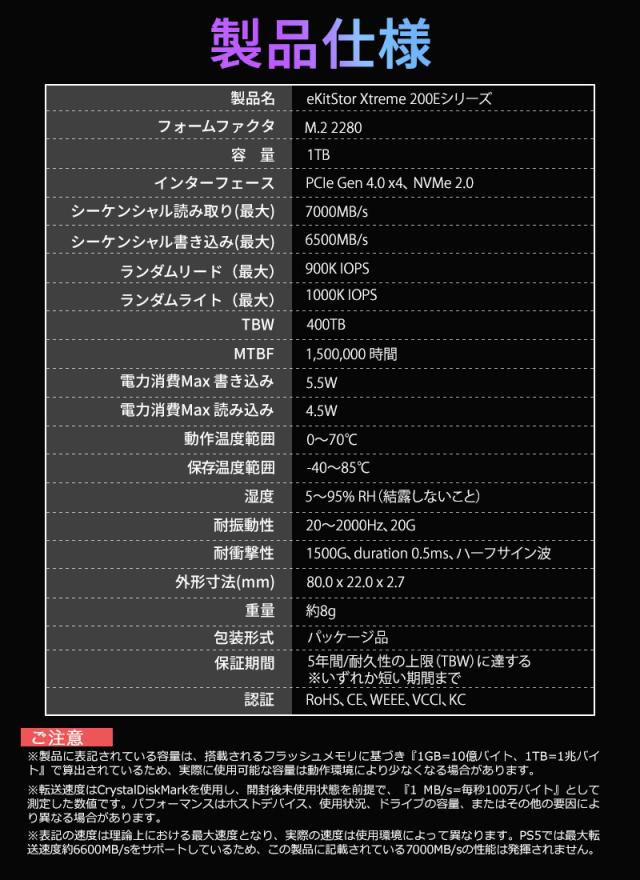保証期間:5年間(保証は、最初の購入日から5年間、または製品データシート上に記載されている最大書き込みバイト総数400Terabytesが書き込まれるまでのうち、いずれか早く到達する日まで有効です。 ご購入前に必ずご確認ください。)