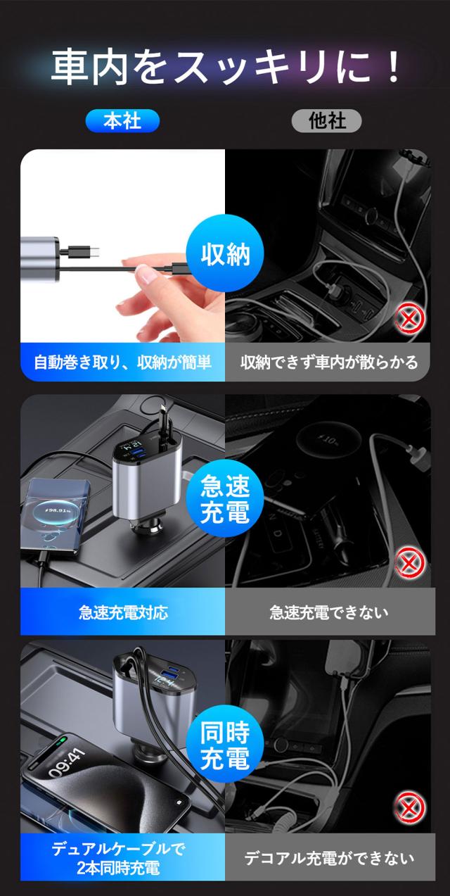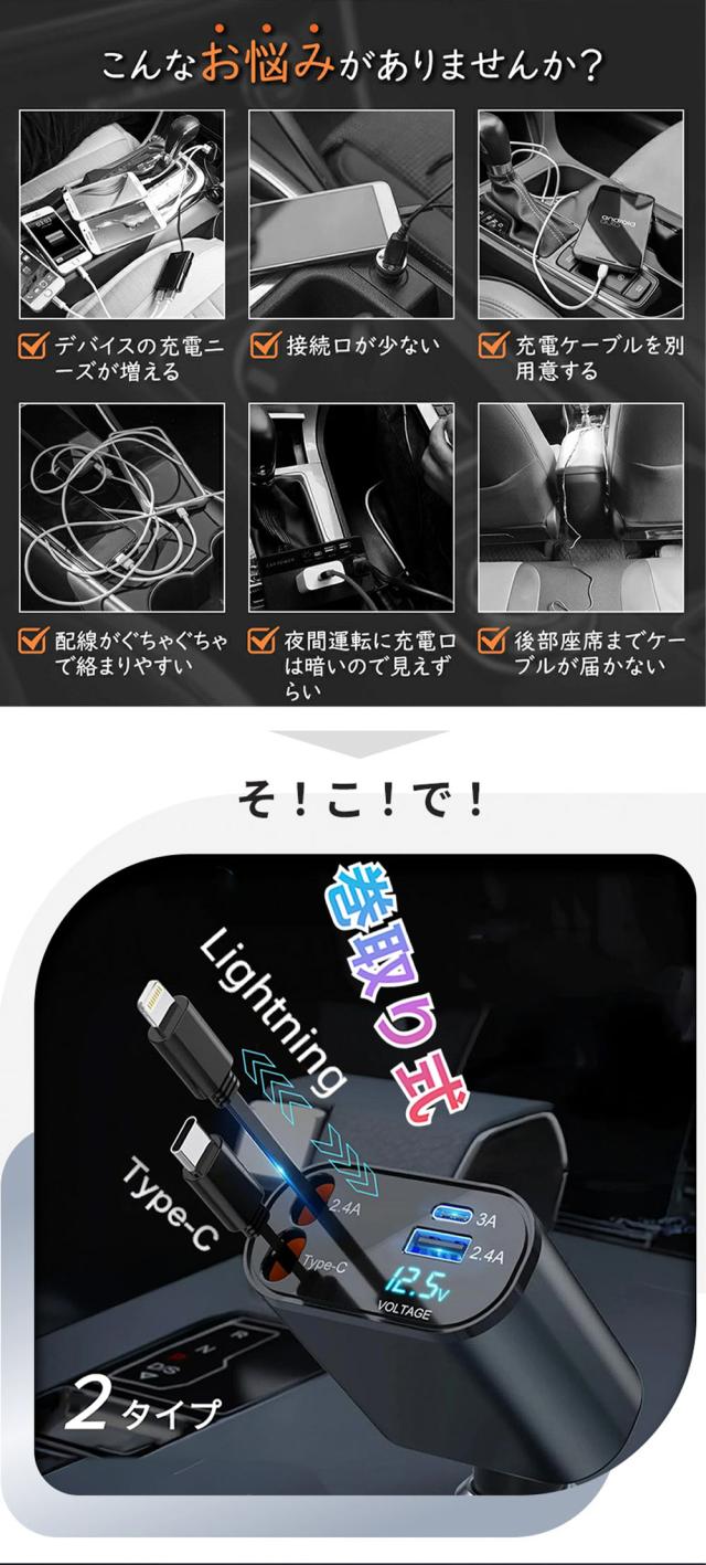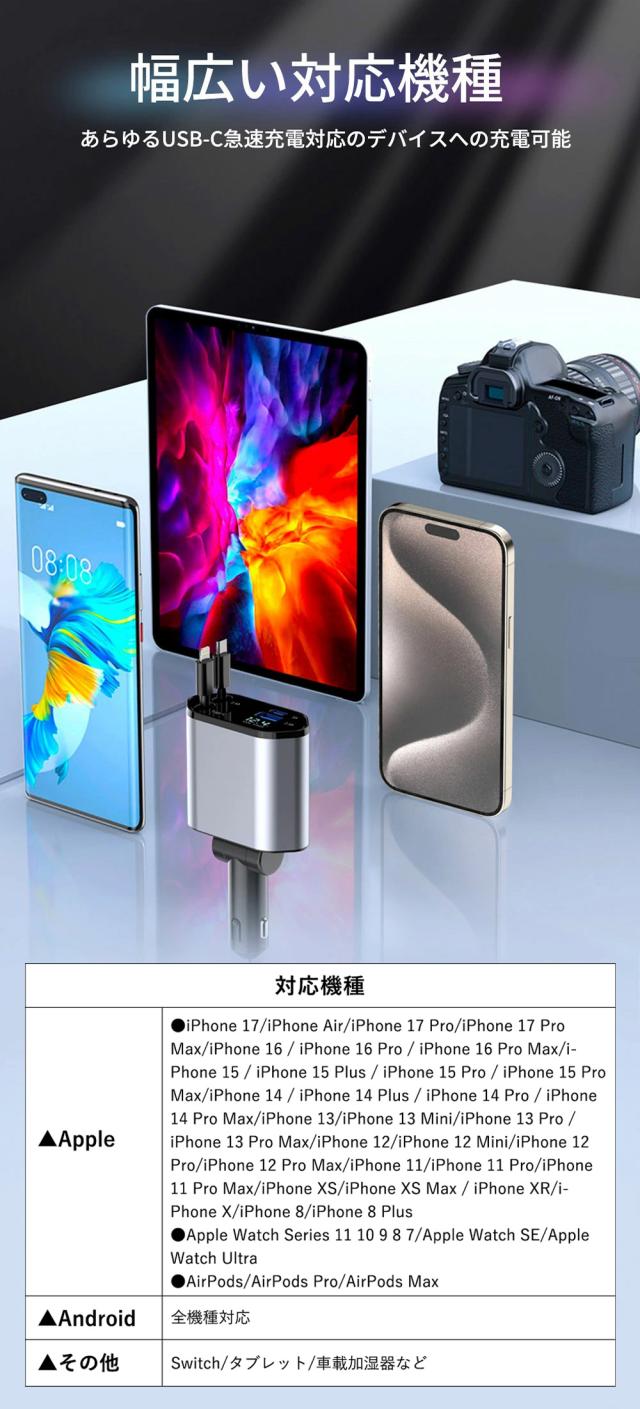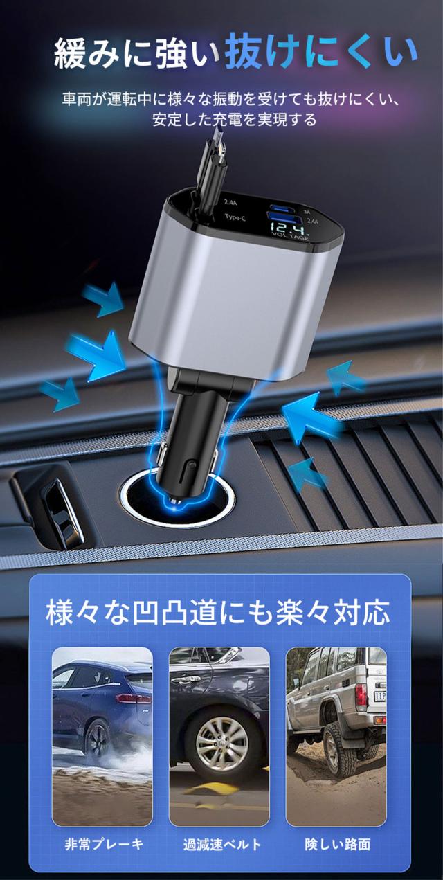 新版シガーソケットは、2USBポート+80cmの伸縮式ケーブル2本付き(MAX 100W)の高速充電を装備。4台のスマホ/タブレットを同時に充電できます。出張仕事、自分の運転、家族・グループ旅行など、多様なシーンで大活躍!高級感を感じさせるデザインと質感で、メタリックグレーのカラーリングが車内のインテリアにもぴったり! iPhone Lightning(5V/2.4A)とAndroid Type-C(9V/2A)の2本の巻き取り式充電ケーブルと、USB-Aポート(5V/2.4A)*1、USB-Cポート(5V/3A)*1の2つの急速充電ポートが付属していて、4台のデバイスを同時に充電できます。