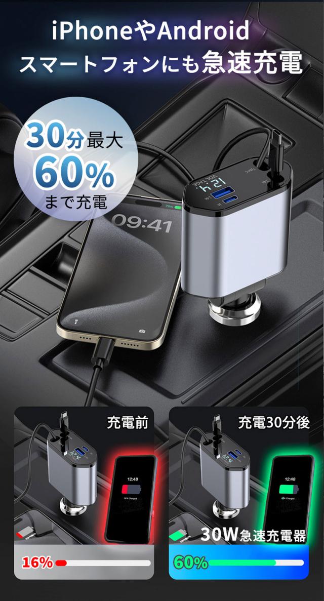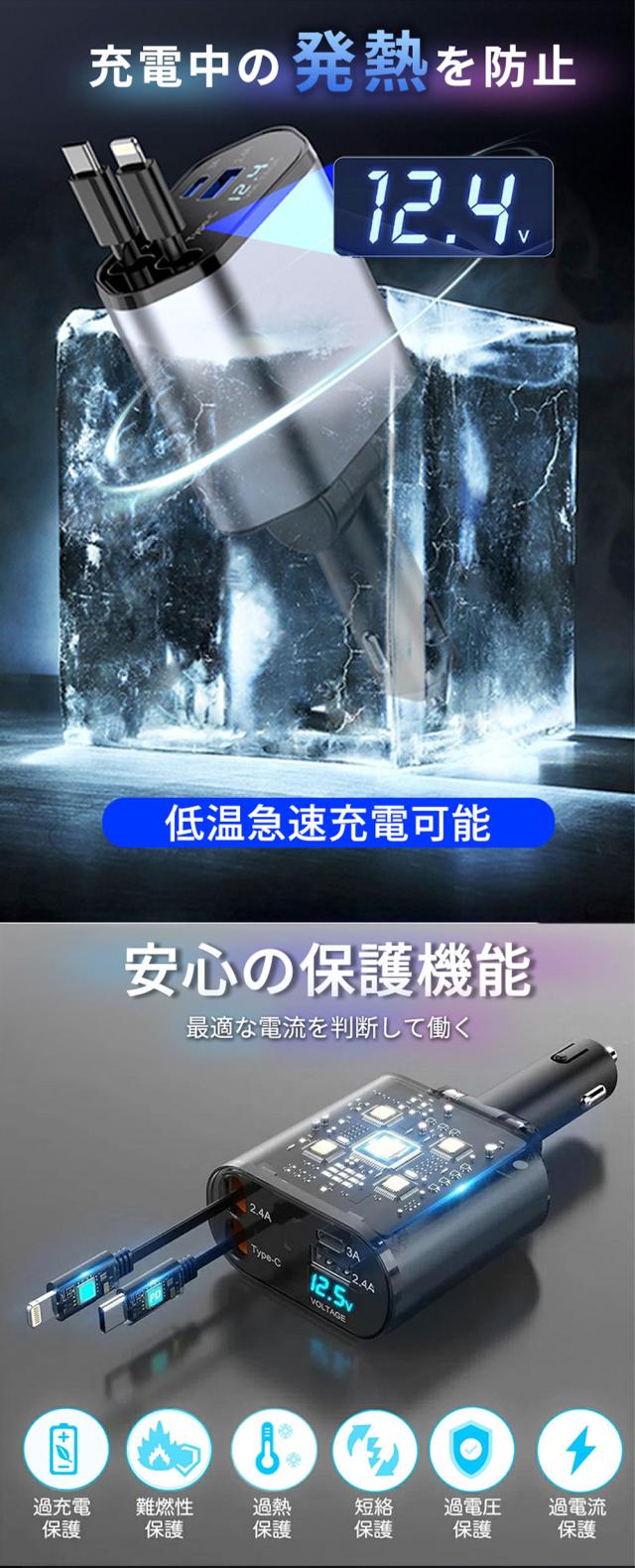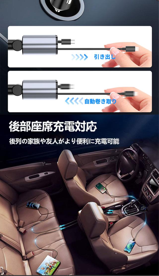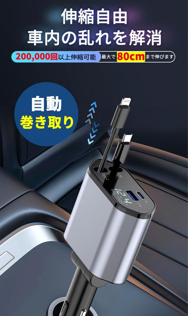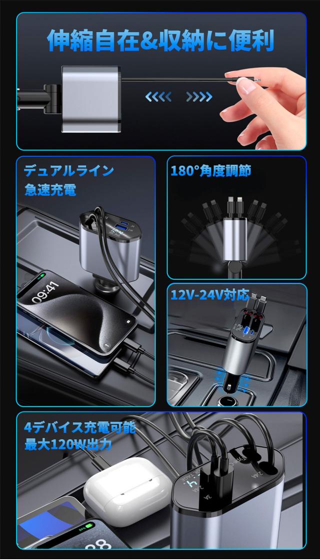 【2026年最新モデル】シガーソケット 充電器 4台同時充電 120W 高速充電 巻取り式ケーブル カーチャージャー USB Type-C Lightning スマホ用 車載充電器 12/24V車対応 多重保護 車の充電器