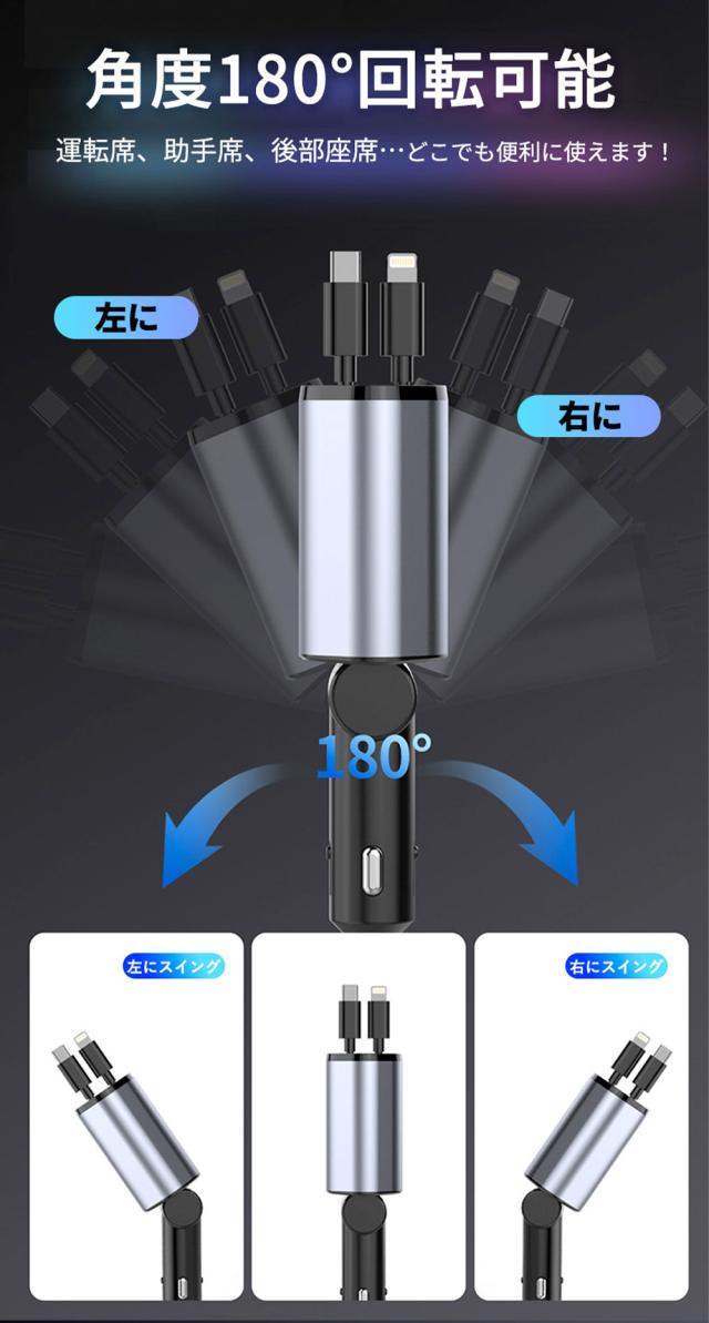 巻き取り式の充電ケーブルで、絡まることなく、車の散らかりにサヨナラ。ケーブルは3cmから80cmまで簡単に伸ばすことができ、プラグは180°柔軟な角度調節できるので、デバイスのリンクがしやすく、前・後座席両方の方とも快適に充電できます。