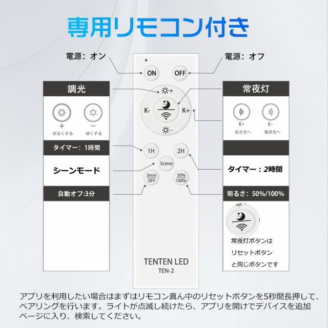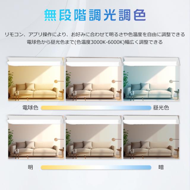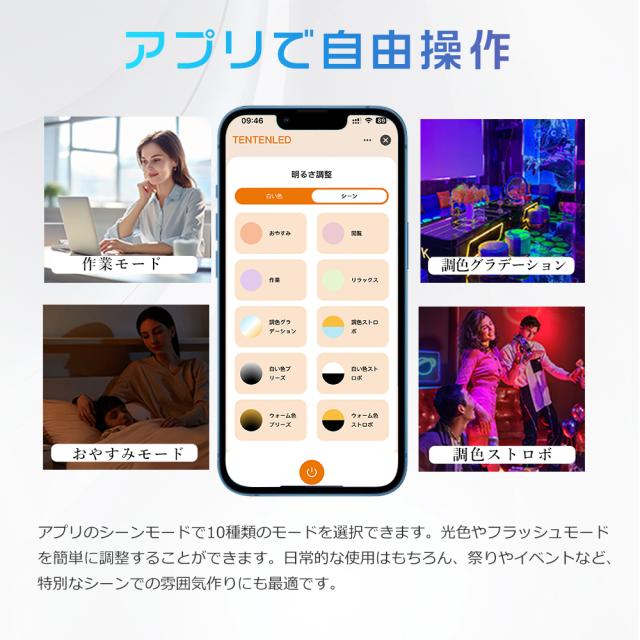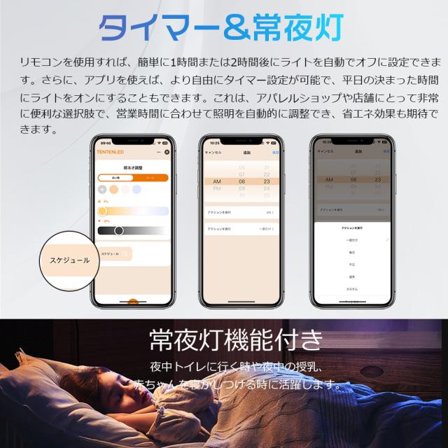 - 本製品は、壁スイッチ、リモコン、スマートフォンアプリの3つの操作方法があり、非常に便利です。壁スイッチで簡単にオンとオフができ、専用のリモコンを使用すれば離れた場所から照明の明るさや色を調整できます。スマートフォンアプリでは、明るさや色温度、タイマー、プリセットシーンなど多様な機能を自由に設定でき、快適な照明環境を実現します。