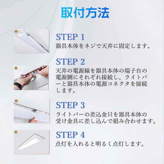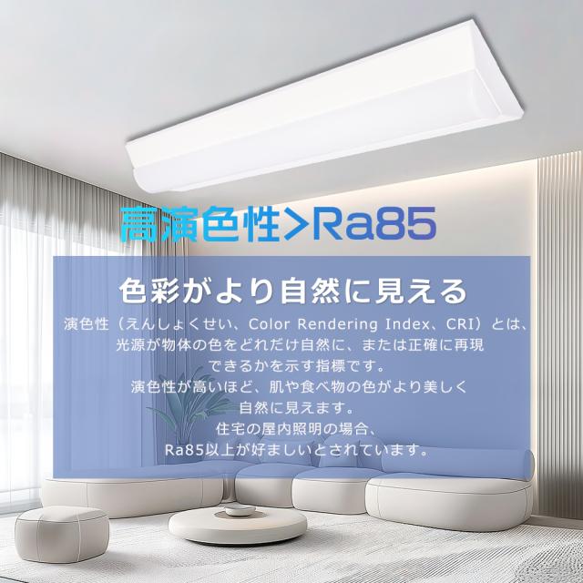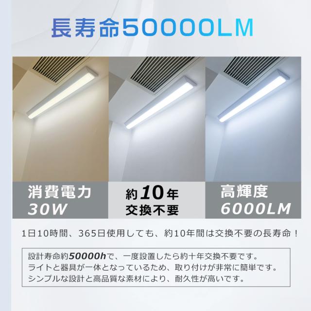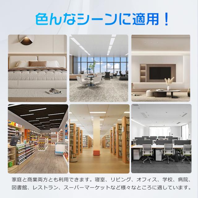 - このLEDベースライトは低消費電力でありながら、明るく均一な高効率の発光を実現しています。省エネ設計により、電気料金の削減と環境への負荷軽減が期待できます。1台のLEDベースライトは、従来の蛍光灯2本分の明るさを提供します。また、一度設定すれば約10年間の交換が不要です。