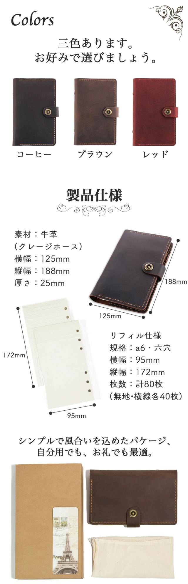 ·手に馴染む柔らかな感触の牛革を、システム手帳の表面·内側に使用した高級感のある造り。·熟練職人の手で一つ一つ手作りしたこだわりの逸品です。深みのあるお洒落なカラーが高級感を演出します。耐久性に優れ、傷つきにくいので長くご愛用いただけます。お洒落なペンホルダー付です。