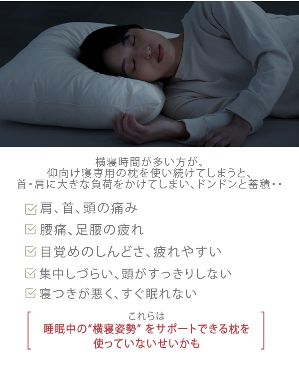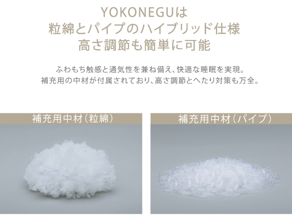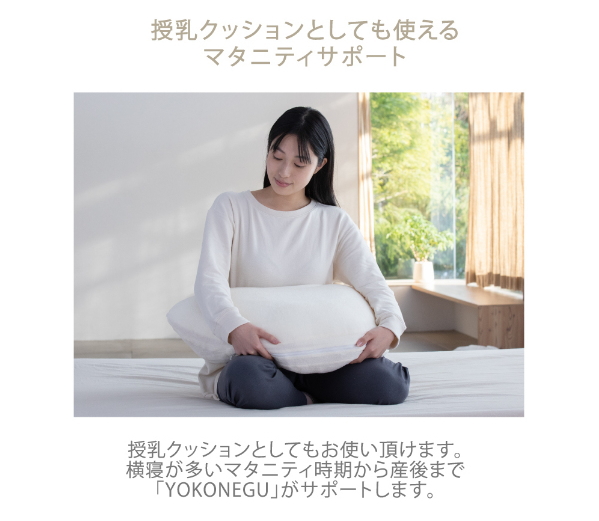 横向き寝をする全ての人を快眠へ導く他にはない特殊構造の枕です。特許取得の2階建て構造(特許 第70634745号)が生み出す「腕肩ポケット」に肩がスッポリとはまり、肩首の体圧が分散されかつてない特殊ブーメラン形状がどんな寝姿勢にもフィットします。横寝が多いマタニティ時期から産後までサポートします。粒綿とパイプのハイブリット仕様、高さ調節も簡単に可能でふわもち触感と通気性を兼ね備え、快適な睡眠を実現しました。補充用の中材が付属されており、高さ調節とへたり対策も万全です。