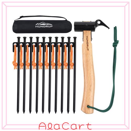 HUNDRUP ペグハンマーセット テントハンマー 30CMペグ 10本 木製ハンドル 専用収納バッグ付き ペグ打ち ペグ抜く