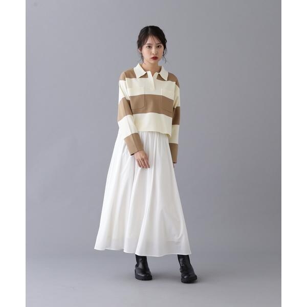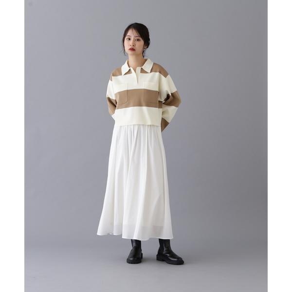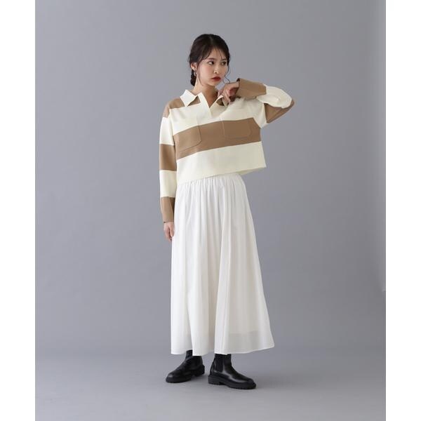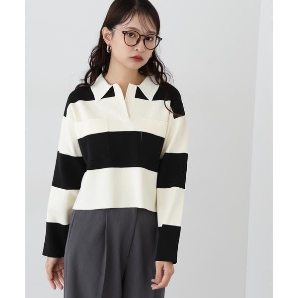 ワイドボーダーが目を引く襟付きニット。体のラインを拾いにくいゆったりとしたシルエットで、胸ポケットがさり気ないアクセントになります。やや短めの着丈なので裾アウトが決まりやすく、マニッシュなパンツやボリューミーなロングスカートとも相性良く着用いただけます。