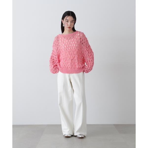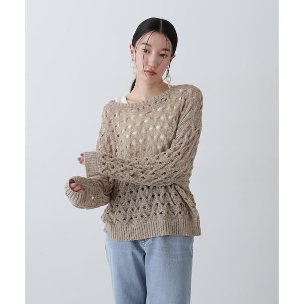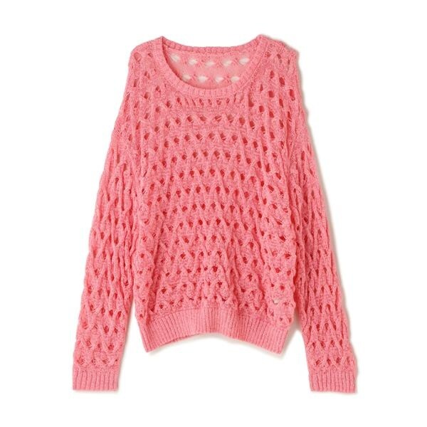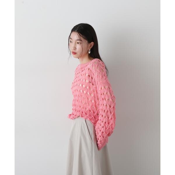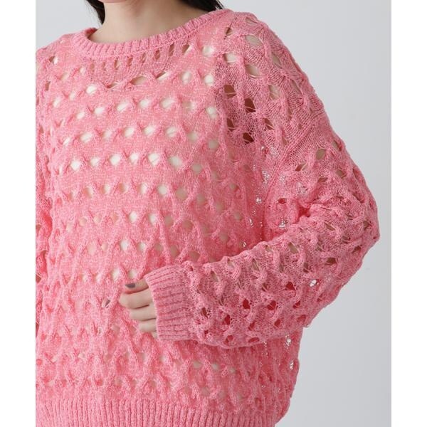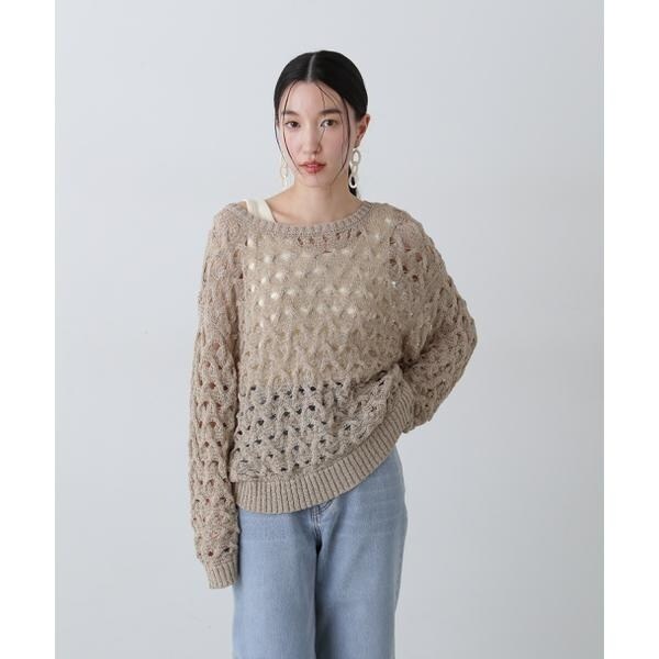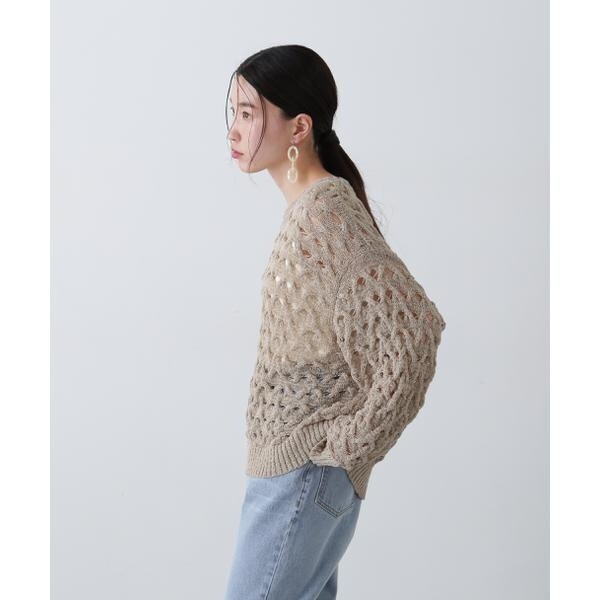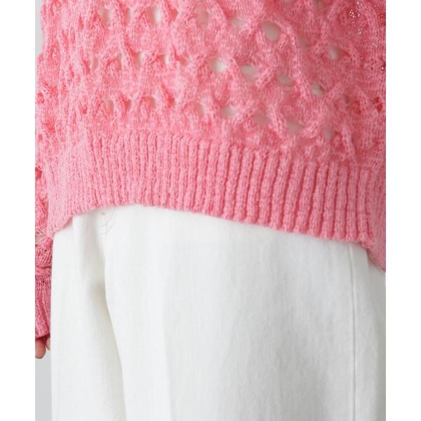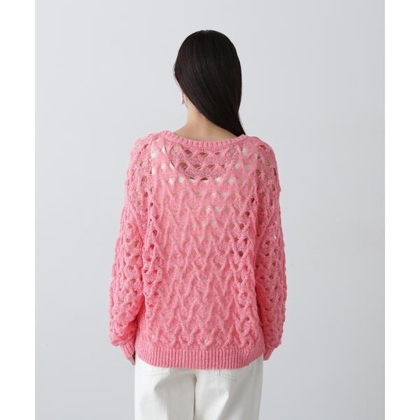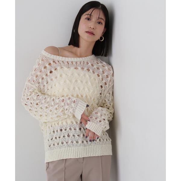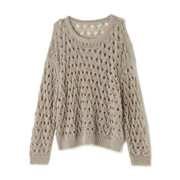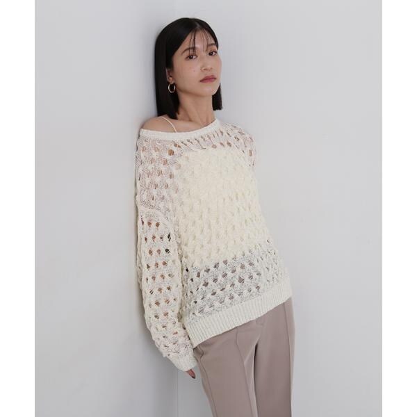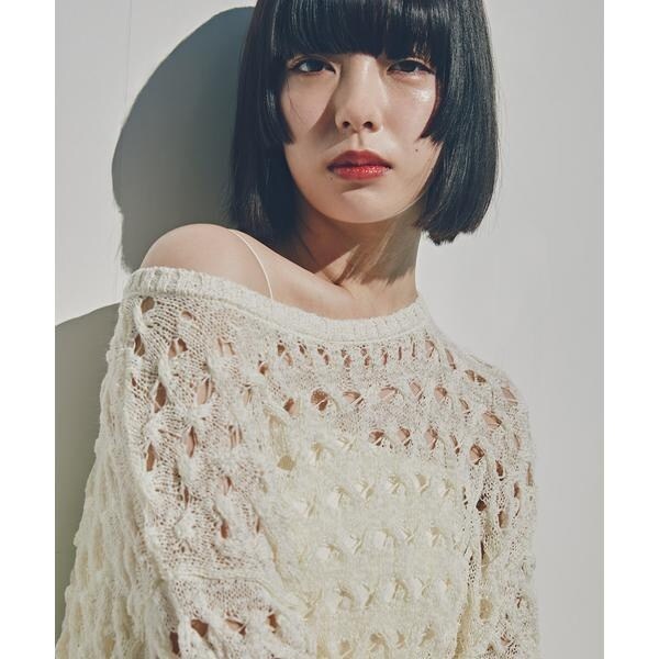 ざっくりとした透かし編みで仕上げたニット。襟ぐりも身頃もややゆるっとしたシルエットと、フェミニンな雰囲気ただよう透かし編みが特徴。ほんのり肌見せする編地なので、お持ちのインナーを合わせると抜け感のあるレイヤードスタイルを楽しめます。マニッシュなパンツやカジュアルなデニムパンツを合わせたコーディネートもお勧めです。