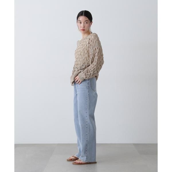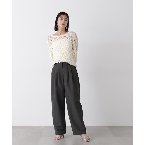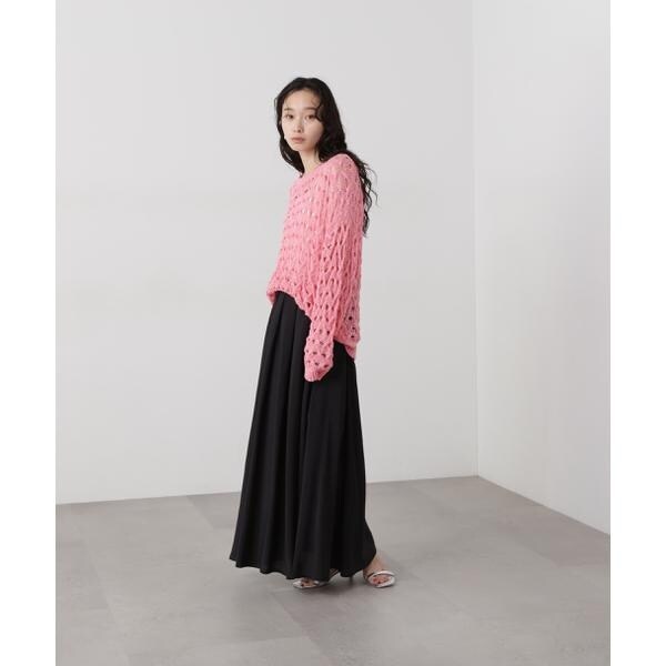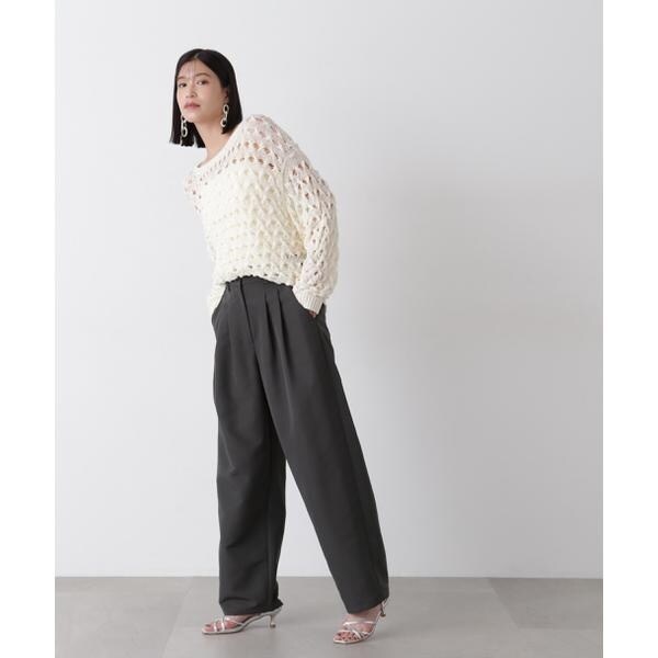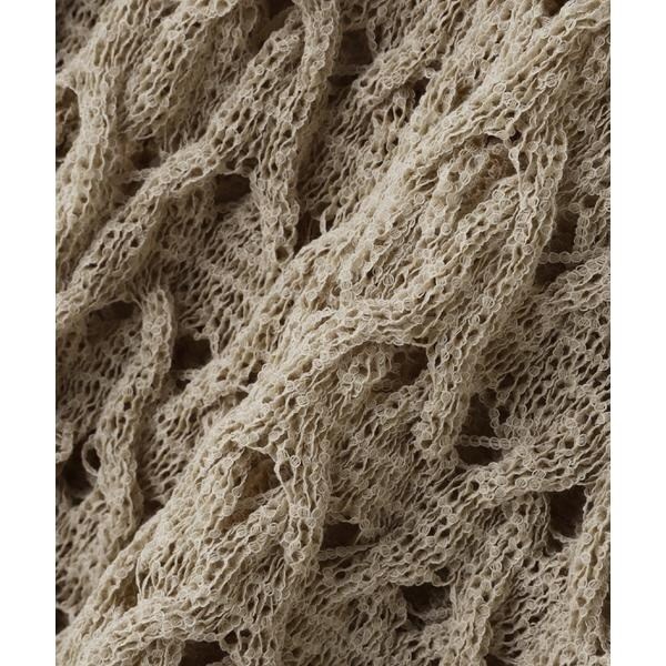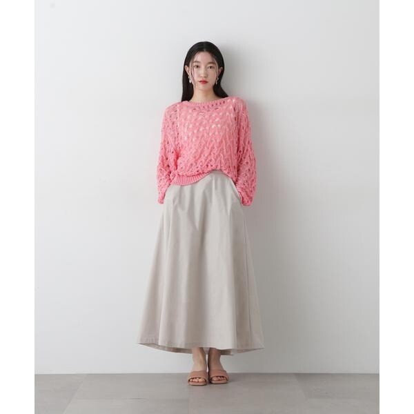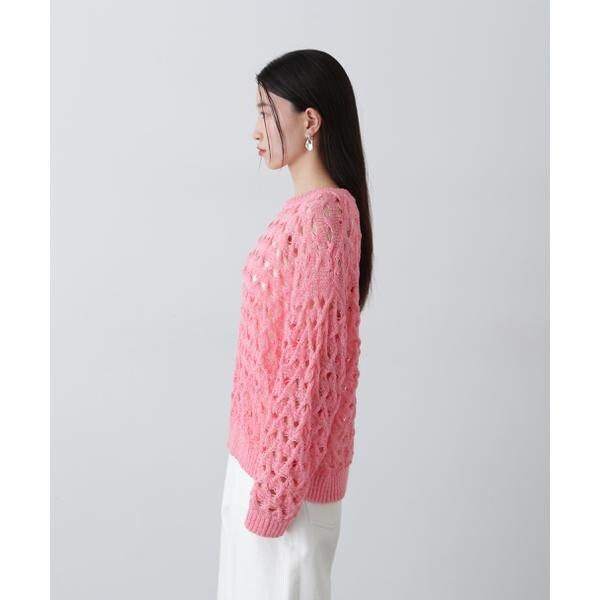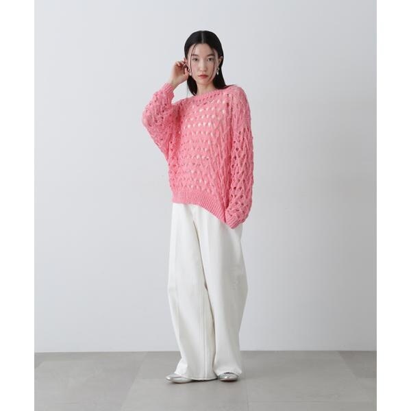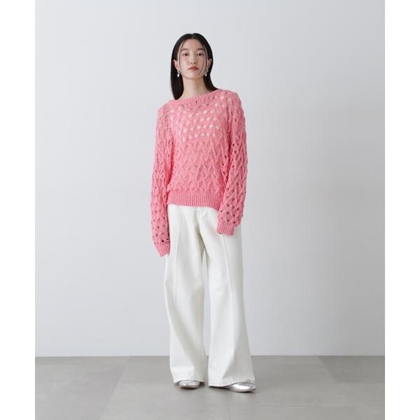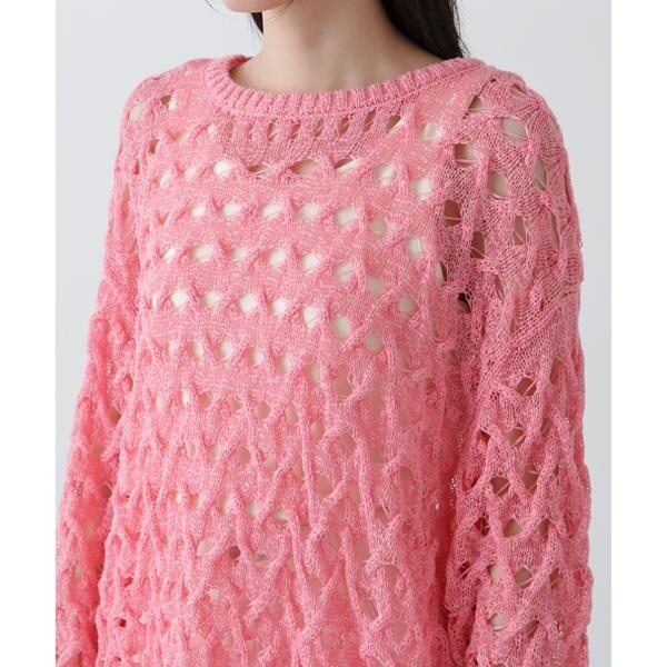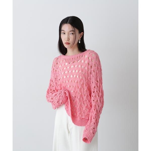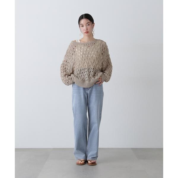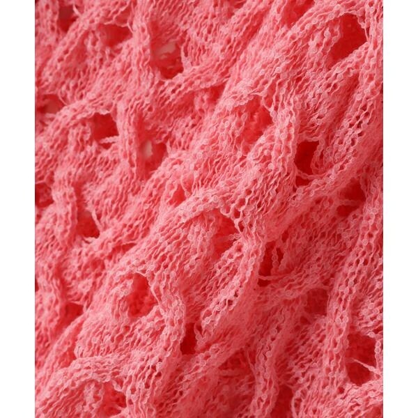 ざっくりとした透かし編みで仕上げたニット。襟ぐりも身頃もややゆるっとしたシルエットと、フェミニンな雰囲気ただよう透かし編みが特徴。ほんのり肌見せする編地なので、お持ちのインナーを合わせると抜け感のあるレイヤードスタイルを楽しめます。マニッシュなパンツやカジュアルなデニムパンツを合わせたコーディネートもお勧めです。
