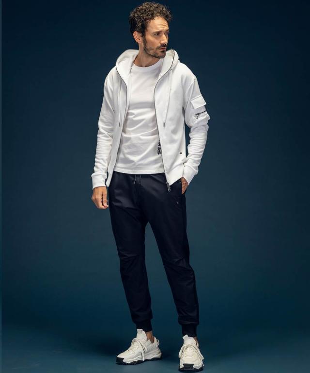 同生地の(uso−25038)⇒フーディーと合わせることで1piuセットアップを可能としたスタイル。