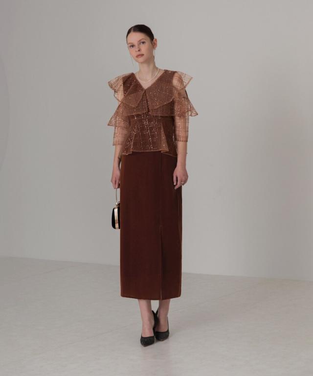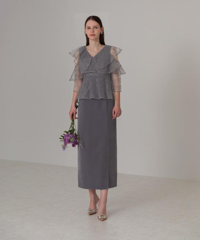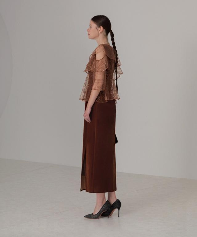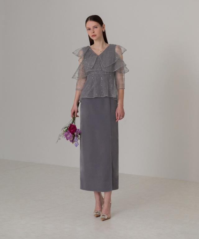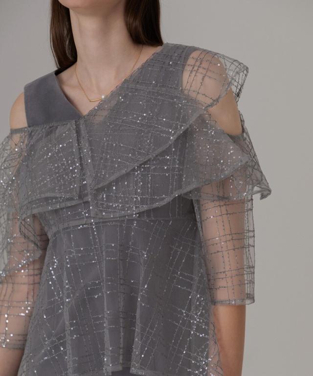 ユニークなデザインのフリルビスチェにスパンコールとチェック刺繍を施し、華やかさと立体感を演出。