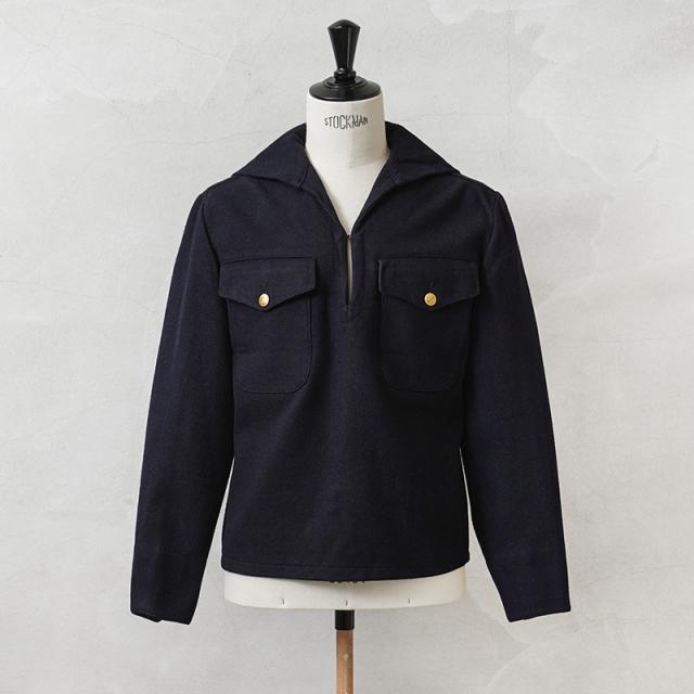 60〜70年代頃のスウェーデン海軍で着用された、軽量で保温性や撥水性に優れたウール メルトン生地のセーラージャケットが入荷しました。 公式行事などフォーマルな席用に仕立てられたもので、品がありエレガントな雰囲気があります。セーラー服特有のプルオーバータイプでスモック風の造り。濃紺に、ポケットや袖口にあしらわれたゴールドのボタンが重厚感のあるアクセントになっています。また、セーラーにスーツジャケットのような3つボタンという珍しいカフスデザインです。フロント首元部分には、着脱も楽に行えるフック付き。胸元のフラップポケットは、二層になっており手の込んだ造りになっています。
