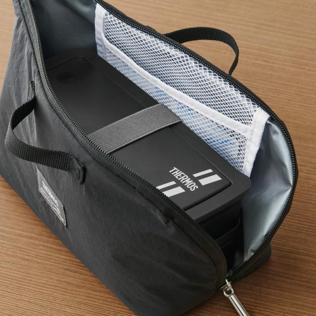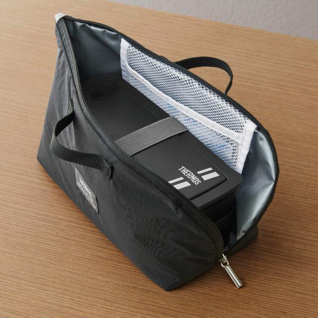お弁当箱にフィットする形状なのでファスナーがガバッと開き、出し入れしやすい仕様です。メッシュポケット付きで保冷剤も入ります。